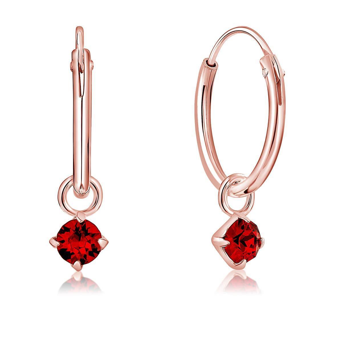 DTPsilver® 925 Sterling Silver Rose Gold Plated SMALL Hoops Earrings & Round Dangling 3 mm Crystals from Swarovski® Elements - Thickness 1.2 mm - Diameter: 12 mm Red Light Siam