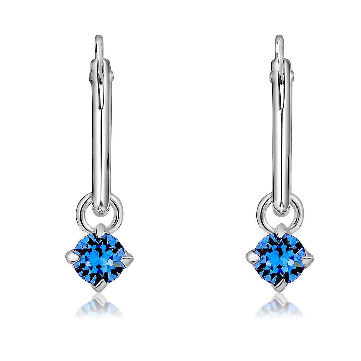 DTPsilver® 925 Sterling Silver SMALL Hoops Earrings & Round Dangling 3 mm Glittering Crystals from Swarovski® Elements - Thickness 1.5 mm - Diameter: 14 mm Blue Sapphire
