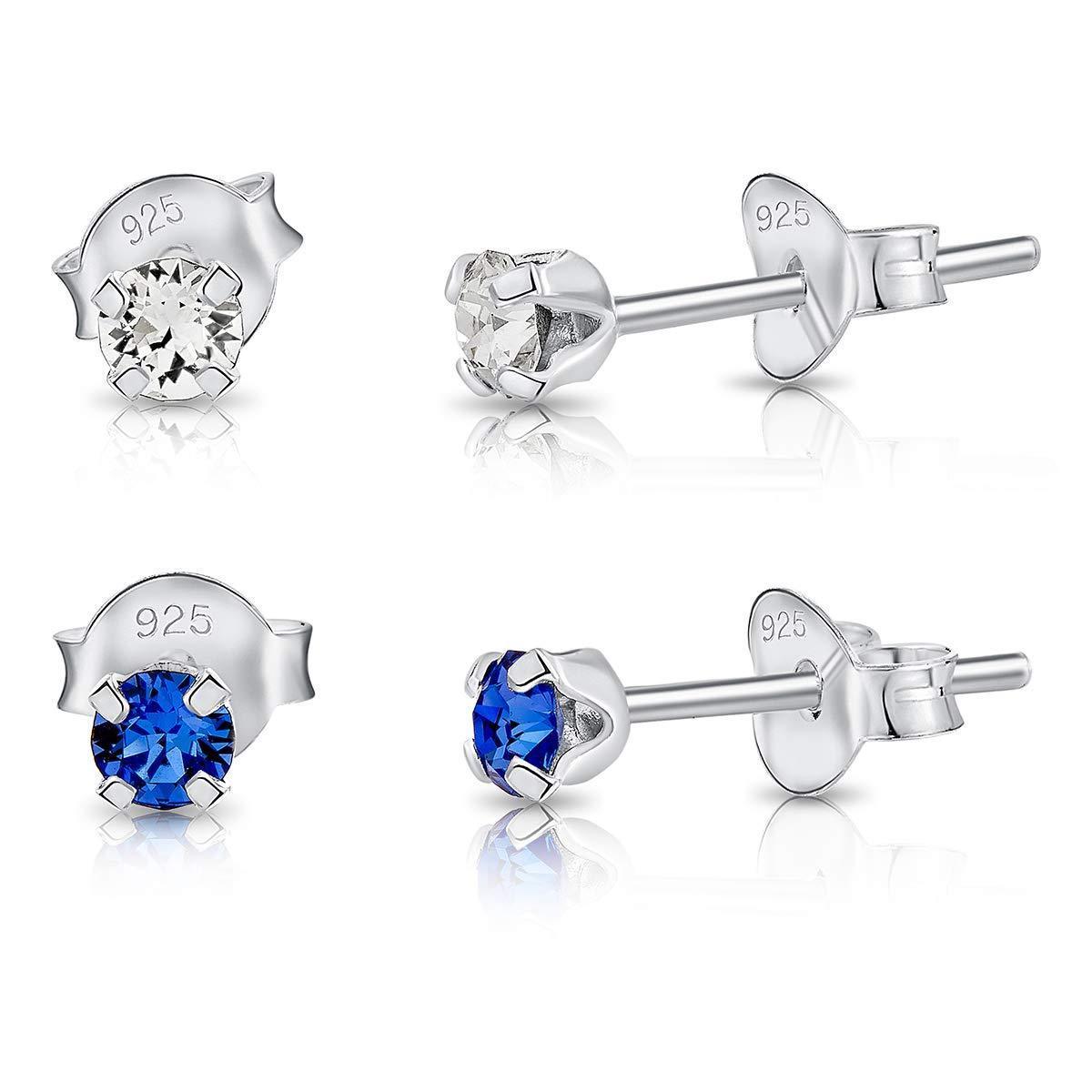 DTPSilver - Set of 2 PAIRS of 925 Sterling Silver * TINY * Round Stud Earrings and Crystals from Swarovski® Elements - Diameter: 3 mm - 1 Pair Clear Crystal & 1 of your Choice - Many Colours to choose from Clear Crystal & Blue Sapphire