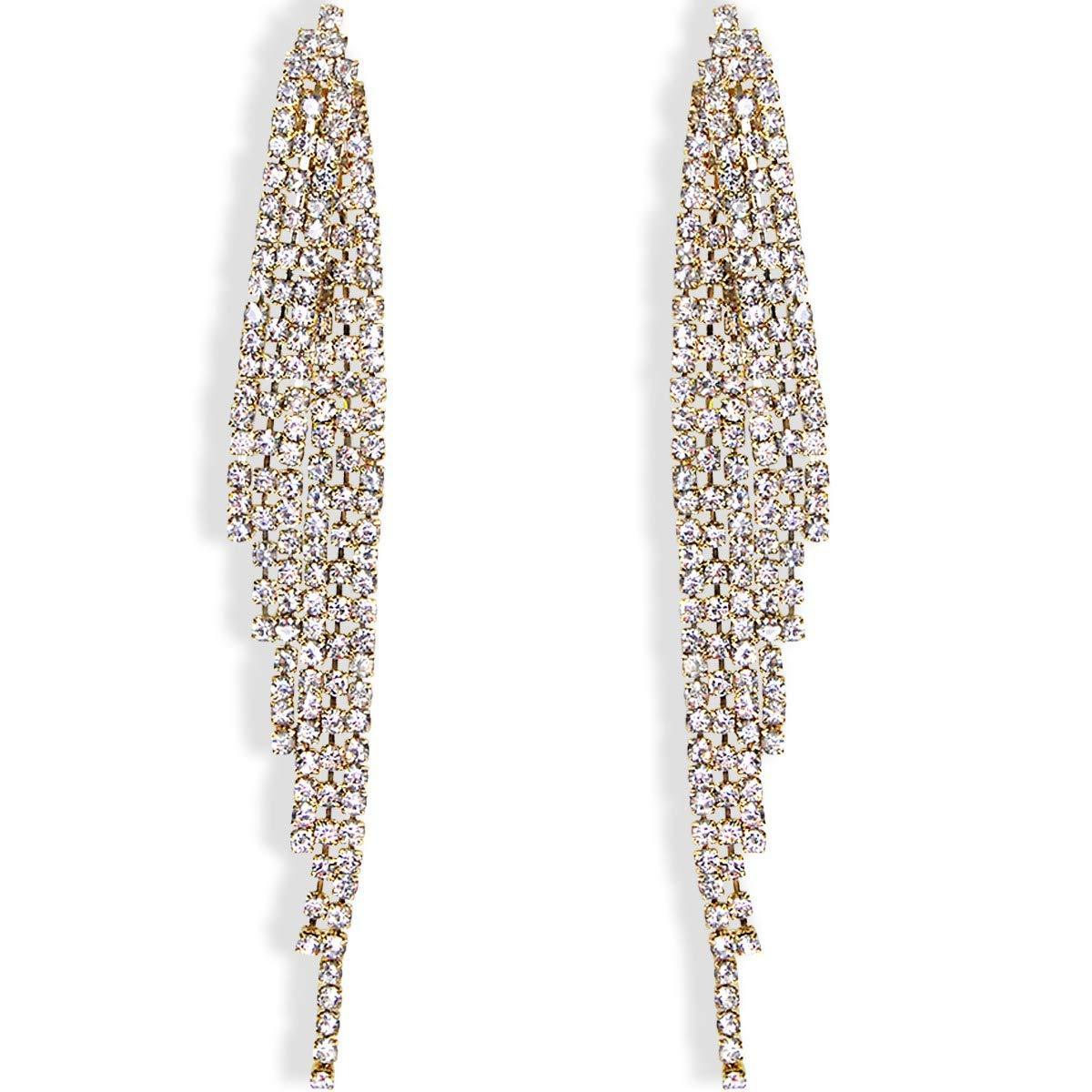 - ELEGANT & STYLISH DESIGN - These sparkly cubic zirconia ear stud earrings feature long, layered chains of rhinestone crystals hanging from a stud post. In unique geometric shapes, the dangling fringes beautifully move and shimmer with every turn of the head.