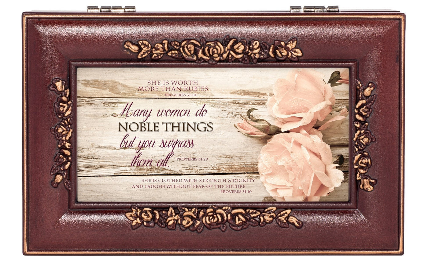 Cottage Garden | Proverbs 31 WomanPetite Rose Jewelry Music Box Founded in 1996, Cottage Garden has been determined to develop and deliver quality products, sentiments and gifts to customers around the nation. In 2006, Cottage Garden began to soar making a name for itself as an industry leader in manufacturing and distributing quality music boxes. We offer a wide variety of music box collections for all ages and any occasions. Perfect for Jewelry and Keepsakes Jewelry music box measures approximately 6 x 4 x 3 inchesOpen cavity measures 3 x 5 inchesMetal photo holders support velvet photo backer Read more Sankyo Musical Mechanism Watch the high quality Sankyo music mechanism play "Canon in D" under protective glass inside the box. Read more Decorative Bun Feet Decorative bun feet are padded to help protect table top and shelf surfaces. Read more Intricate Details Embossed rosette details with brushed gold toned accents. Read more