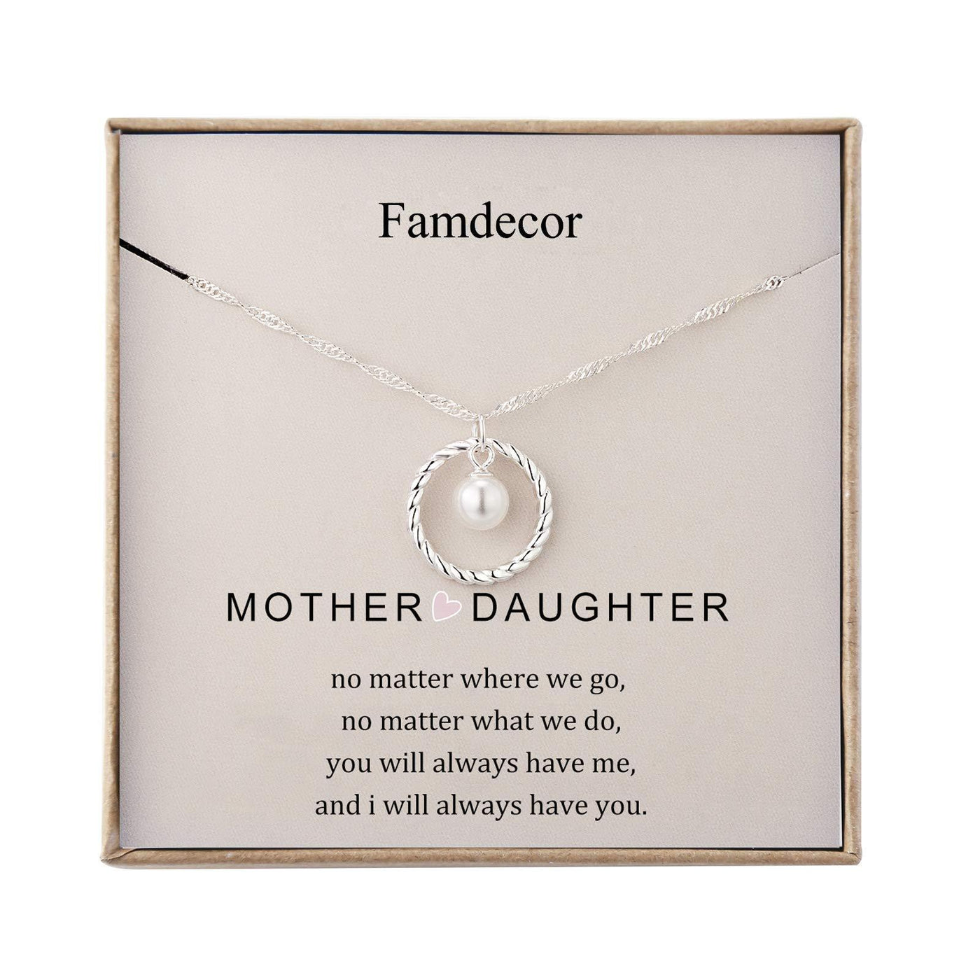 Famdecor brand name is taken from the first few letters of Family and decoration, which means decorative gifts between family. Our products are made of high-quality polished sterling silver and are packed in exquisite gift boxes. They are great gifts for grandmothers, mothers, daughters, and nieces. Grandmother Necklace Grandmother & Granddaughter No Matter Where We Go, No Matter What We Do, You Will Always Have Me, and I Will Always Have You. Mother Daughter Necklace Mother & Daughter No Matter Where We Go, No Matter What We Do, You Will Always Have Me, and I Will Always Have You. Niece Necklace To my Awesome niece. Always remember you are BRAVER than you believe, STRONGER than you seem, SMARTER than you think, & twice as BEAUTIFUL as you'd ever imagine. I LOVE YOU ALWAYS AND FOREVER. Bonus Daughter Necklace Best Bonus Daughter, I didn't give you the gift of life, Life gave me the gift of you. The bond between us is an eternal one. Because it is not DNA, flesh or blood, But HEART that makes us family. I consider myself blessed and lucky to have you in my life. Read more The necklace is made of 925 Sterling Silver .Chain Length 18 inches. High quality will not turn your skin green or red or itchy. Read more Mother Daughter Necklace Grandmother Granddaughter Necklace Niece Necklace Bonus Daughter Necklace