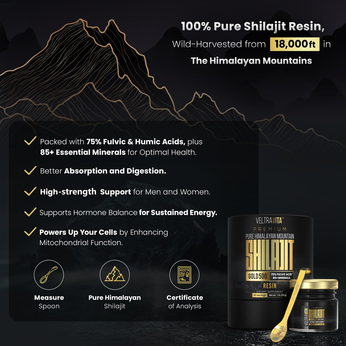 - [Premium Gold-Grade]: Experience pure Shilajit resin, sourced from the pristine Himalayan Mountains at 18,000 ft altitude. This Shilajit gold is naturally extracted from ancient rocks, preserving its potency and authenticity. Our Shilajit for men and Shilajit for women supports energy, endurance, and overall vitality. Made for those seeking the best Shilajit, its a must-have mens supplement for optimal performance