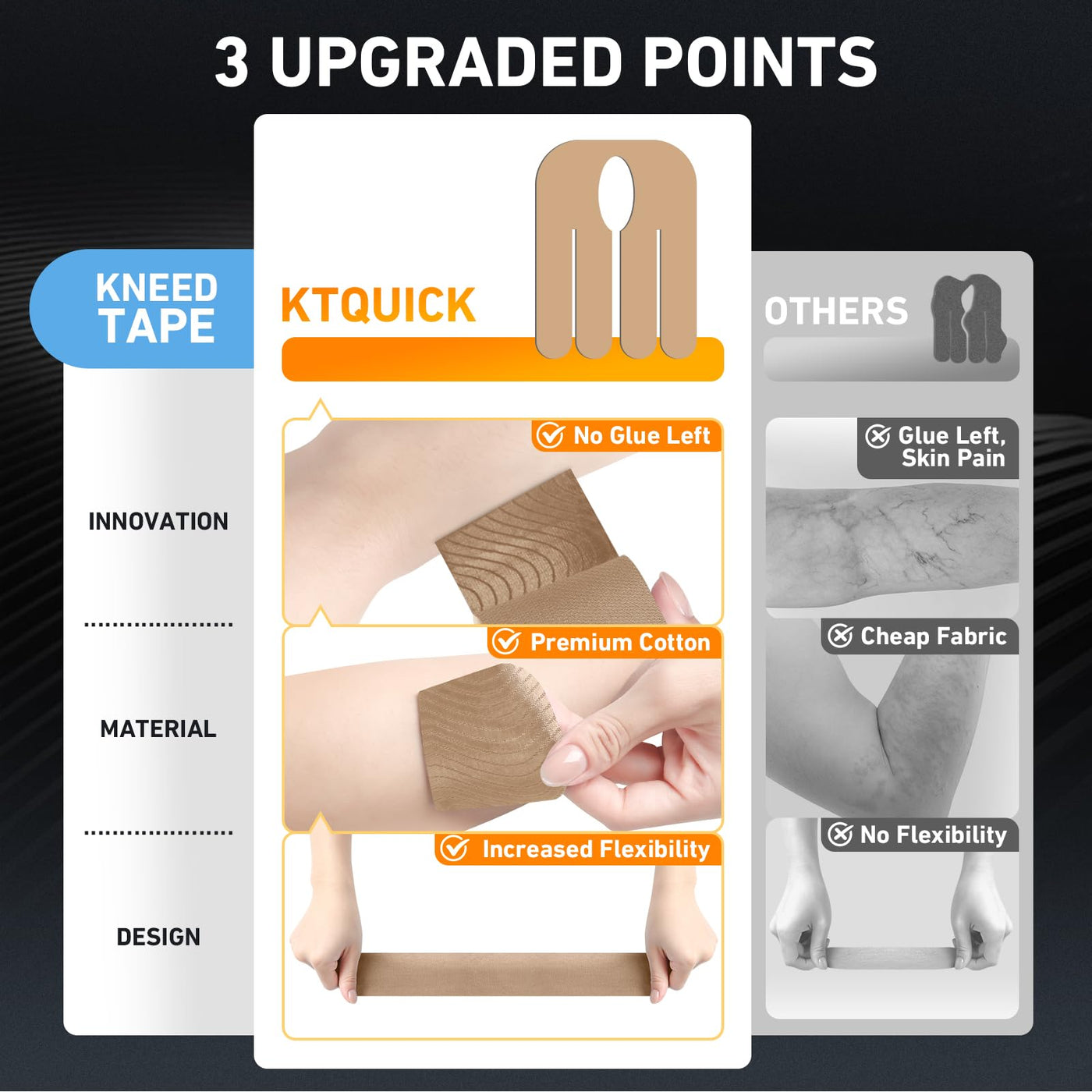 - OUR BRAND PROMISE - KTQUICK is a professional kinesiology tape precut production team, we are committed to researching sports tape that fit all parts of the human body. Please trust our responsibility. If youre not completely satisfied with your purchase, please contact us immediately. We are committed to resolving your concerns promptly by offering a refund or replacement as soon as we receive your feedback.