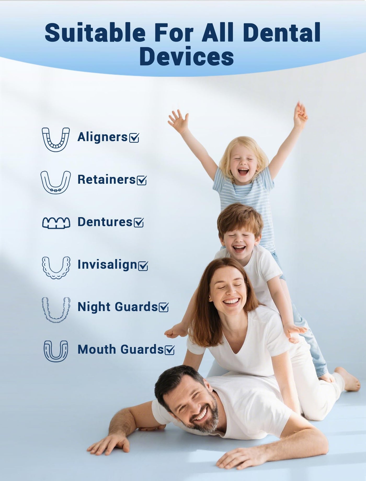 - All Dental AppliancesSuitable for all removable dental devices, including dentures, Invisalign, retainers,aligner, night guard, snoring devices, sports mouthguards, and temporomandibular joint devices. It can also be used to clean stubborn tea stains and limescale from cups and teapots, offering multiple uses and worry-free care.