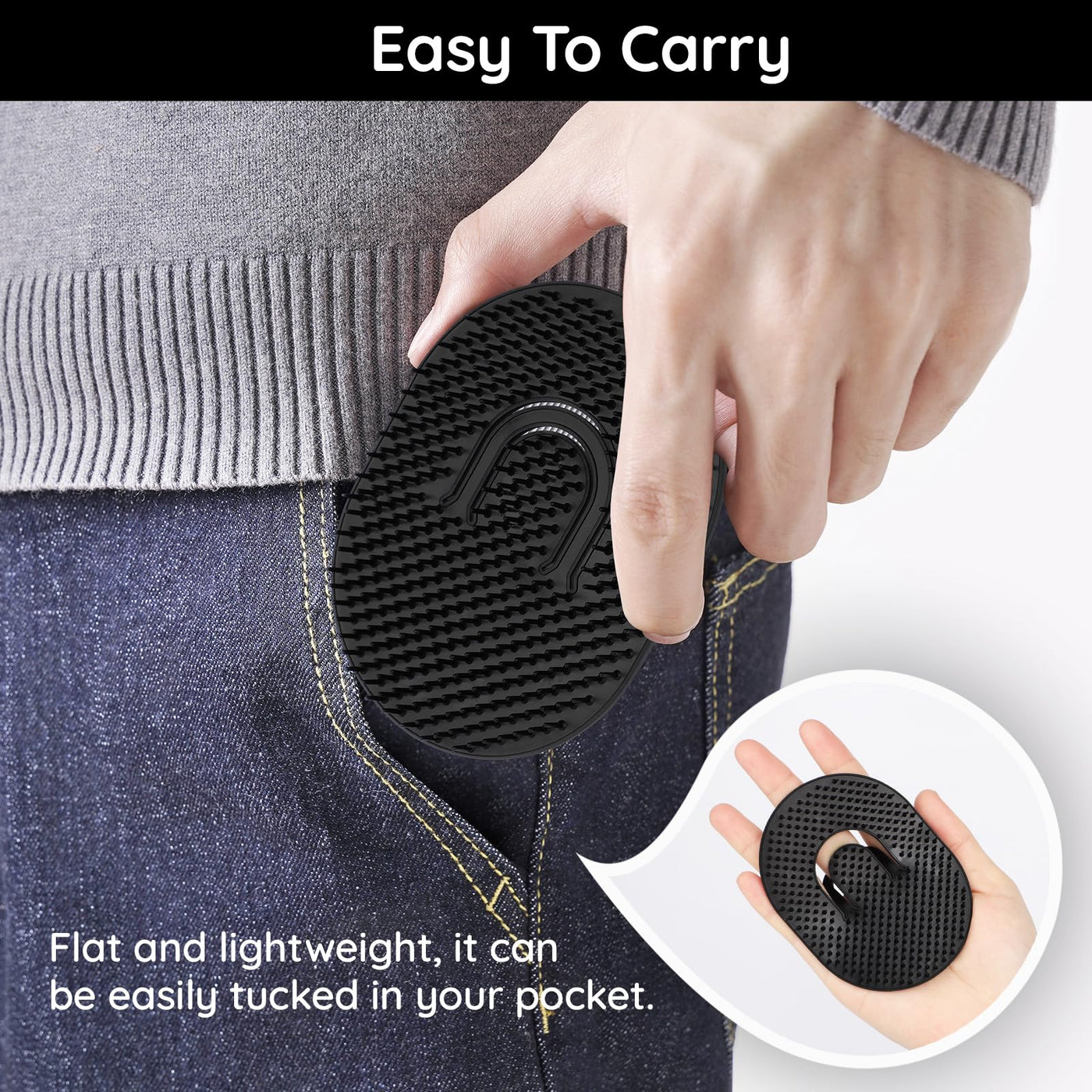 - MULTI-PURPOSE: This pocket hair brush is a flat, pocket-sized, 1 fingered loop plastic brush ideal for all-purpose styling. Slip on your hand for easy styling. With round tip bristles, it's great for scrubing and massaging scalp, brushing out the loose hairs, spreading conditioner through your hair, or even as soap holder!