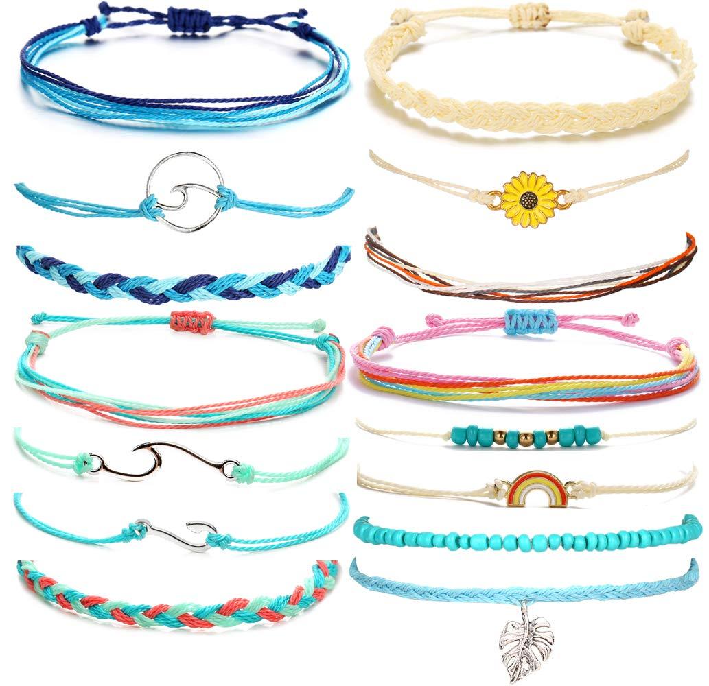 14 Pieces Wave Strand Anklet Bracelets Set,Handmade Cute Sunflower Bracelets Adjustable Braided Rope Bracelet Bohemian Beach Friendship Jewelry Gifts