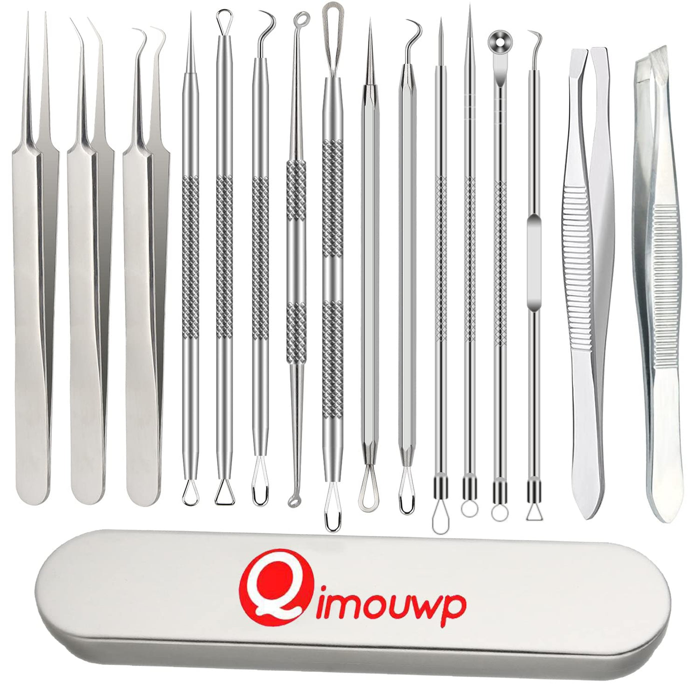 - 1. Set configuration: 2025 Latest Qimouwp 16 piece set tools, 1 storage box, 14 acne removal needles, remove all kinds of stubborn acne, blackheads, whiteheads, comedones, abscess, the right tool for different situations Can be used with 2 clips, for eyebrows, nose care, a set of tools for whole face care.