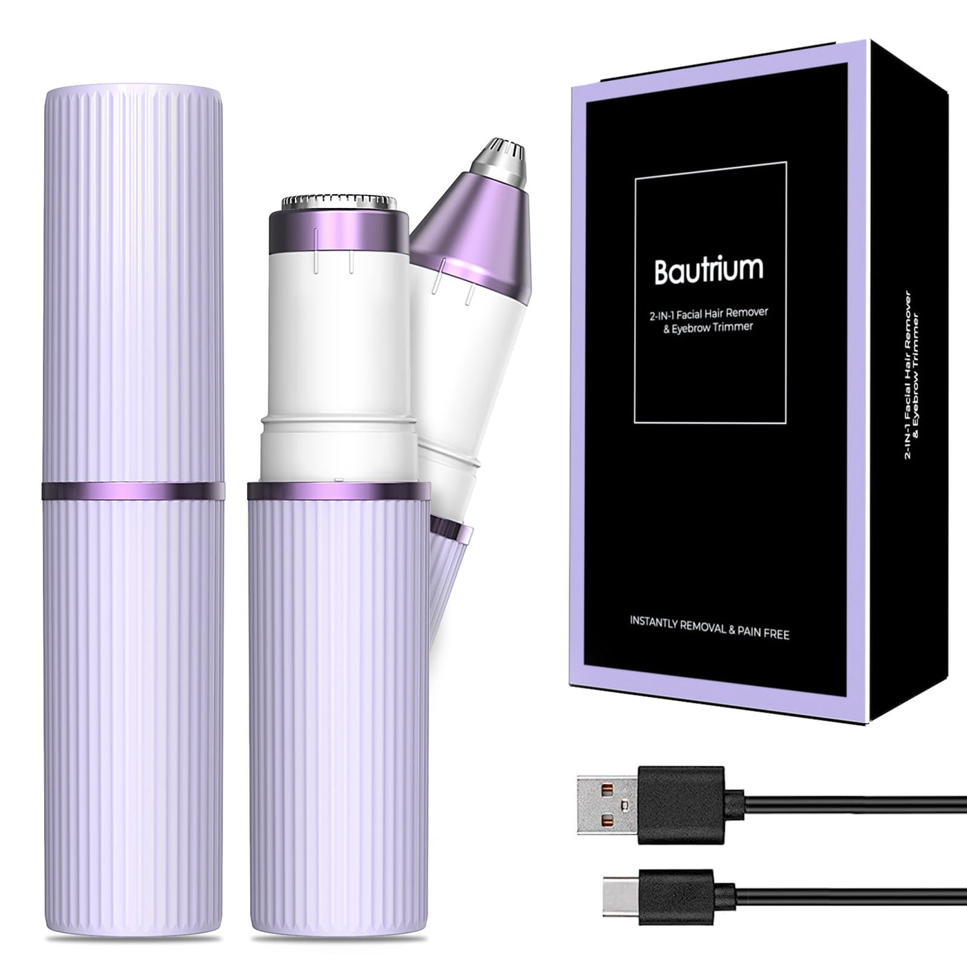 2-in-1 facial hair remover kit for women, Bautrium electric facial razor, eyebrow razor for women with USB-C cable & Storage bag
