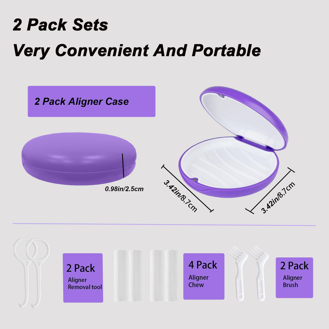 2 Pack Aligner and Retainer Case,Compatible with Invisalign,Mouthguard Case Kits, Portable Aligner Cases with Chew Remover Tool and Brush, Purple