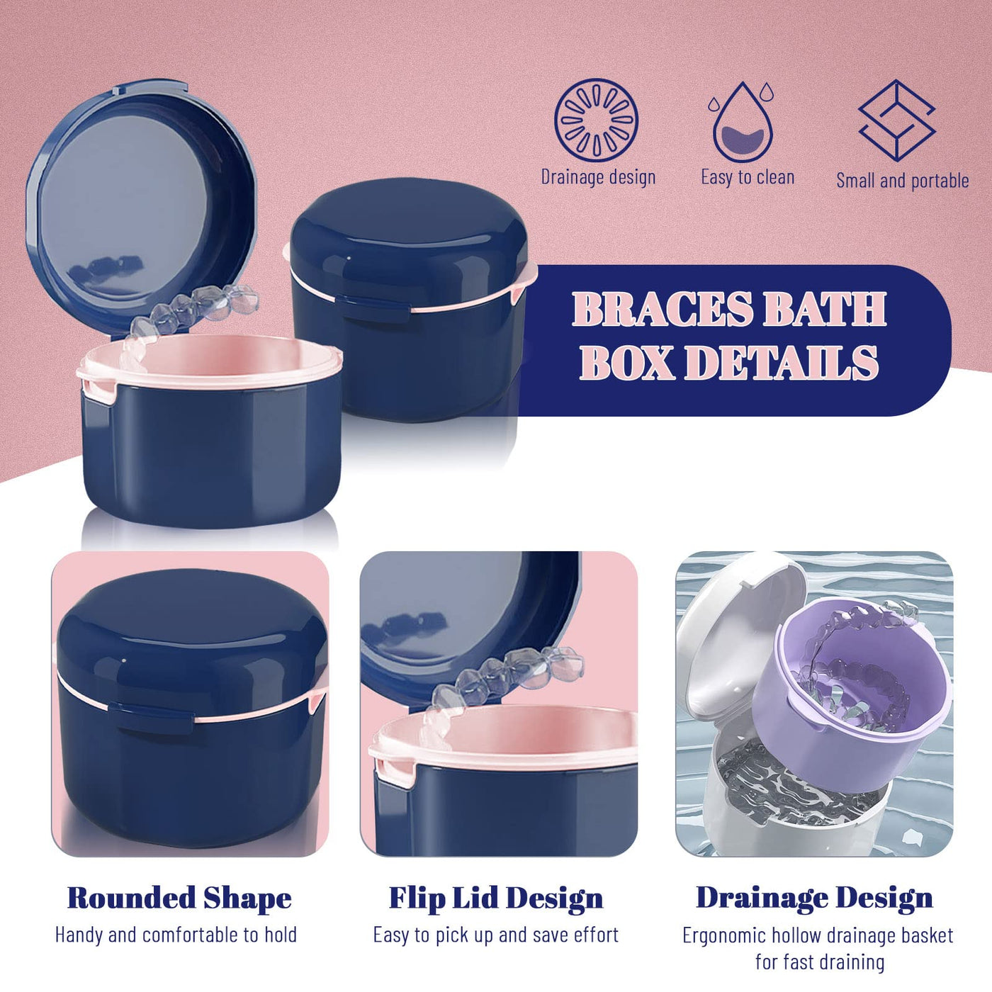 - FASHIONABLE AND BEAUTIFULThe retainer cleaner case adopts two-color design, the outer shell is blue, and the inner basket is pink, and the overall appearance is stylish. Round shape, comfortable to hold.