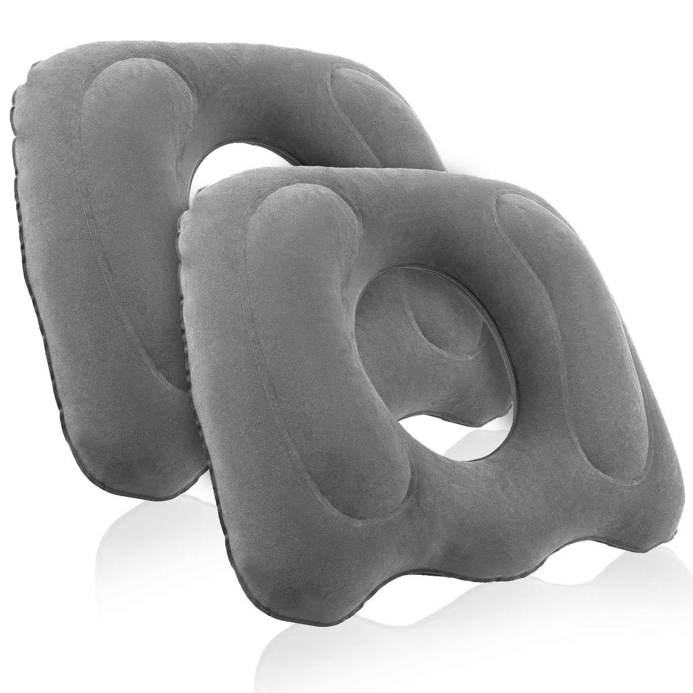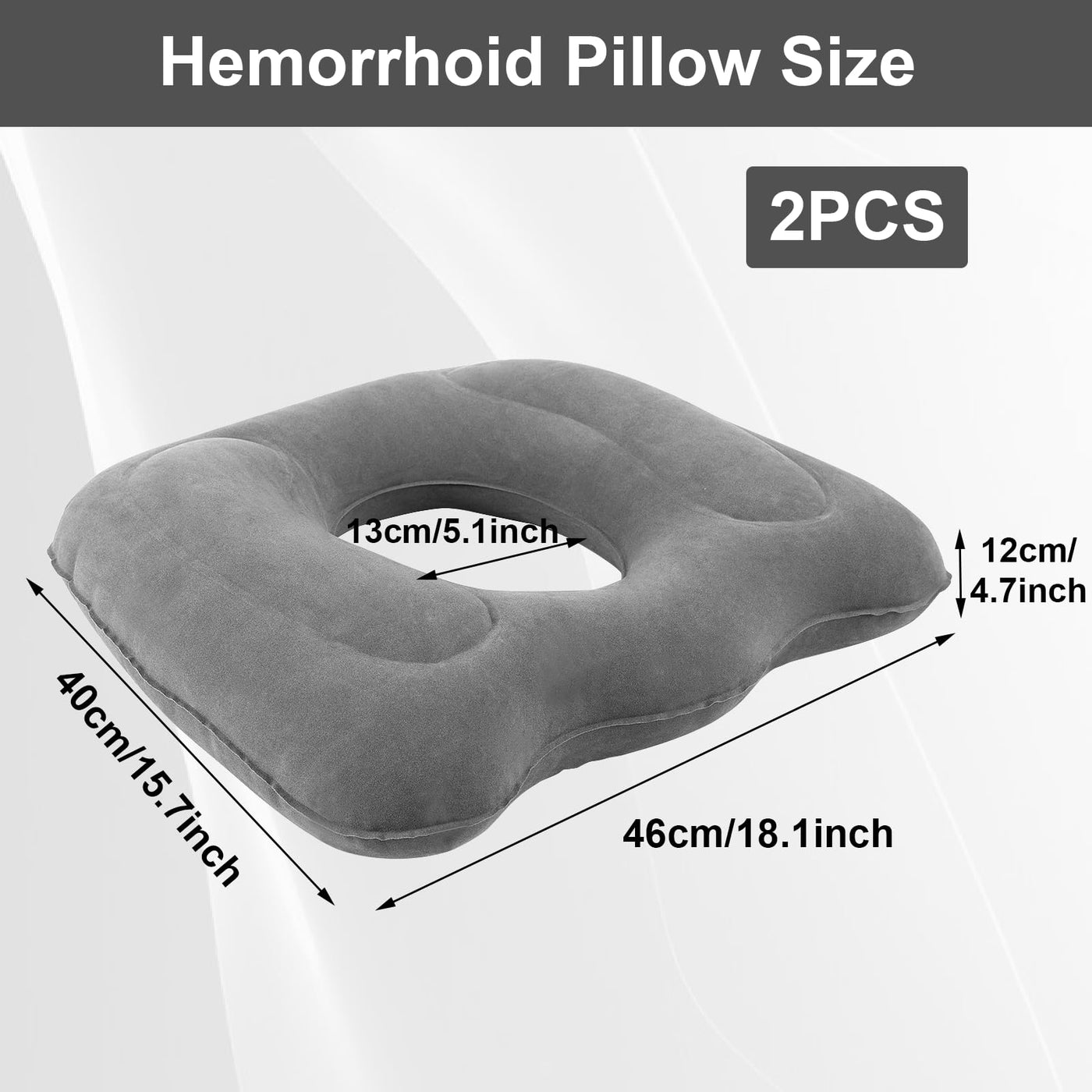 ": The package contains 2 gray inflatable donut pillow seat cushion. These comfortable cushions are sure to be loved by most people, and you can share them with family, friends, and colleagues. Superior Support: This donut cushion for tailbone pain is an excellent pillow for treating hemorrhoids, pregnancy-related discomfort. It is ideal for prolonged sitting, providing relief for the coccyx and reducing pressure on the buttocks, effectively alleviating coccyx pain and discomfort caused by prolonged sitting. Easy to inflate/deflate/adjust: Our butt pillows for sitting tailbone features an upgraded quick-release valve, allowing you to inflate it in seconds using a pump or blow it up in just a few seconds with your mouth. You can adjust the inflation level to find your desired firmness and comfort. Suitable scenarios: Portable and suitable for any type of chair, such as wheelchairs, office chairs, airplane seats, car seats, dining chairs, etc. Dimensions: Outer diameter: 45.5 cm / 17.9 inch (L), 39 cm / 15.4 inch (W) Inner diameter: 19.5 cm / 7.7 inch (L), 16 cm / 6.3 inch(W) Height: 11cm / 4.3 inch Material: PVC material "