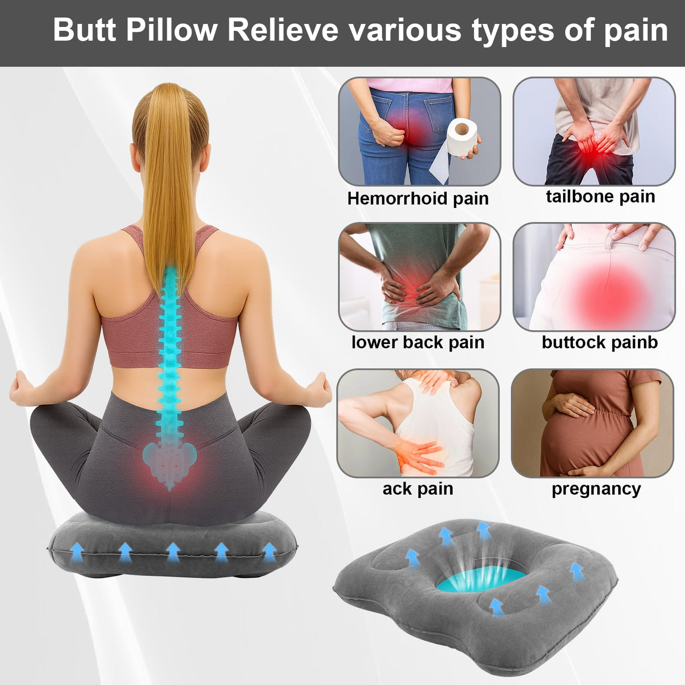 - Exceptional Support: This inflatable donut cushion is an excellent solution for hemorrhoid , pregnancy and coccyx discomfort. Designed for prolonged sitting, this tailbone cushion effectively reduces hip pressure and alleviates tailbone stress, thereby relieving hemorrhoid pain and discomfort caused by extended sitting. Our inflatable hemorrhoid cushion minimizes perineal pressure and eases pelvic pain.