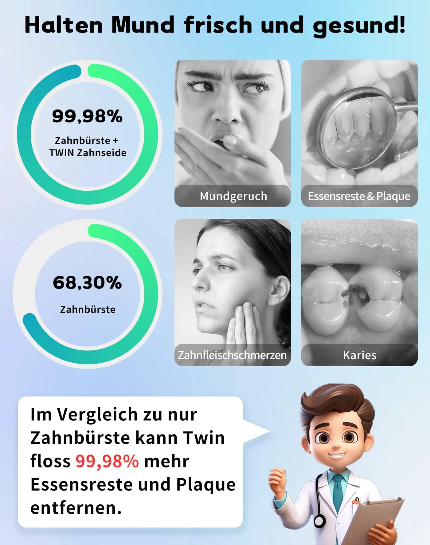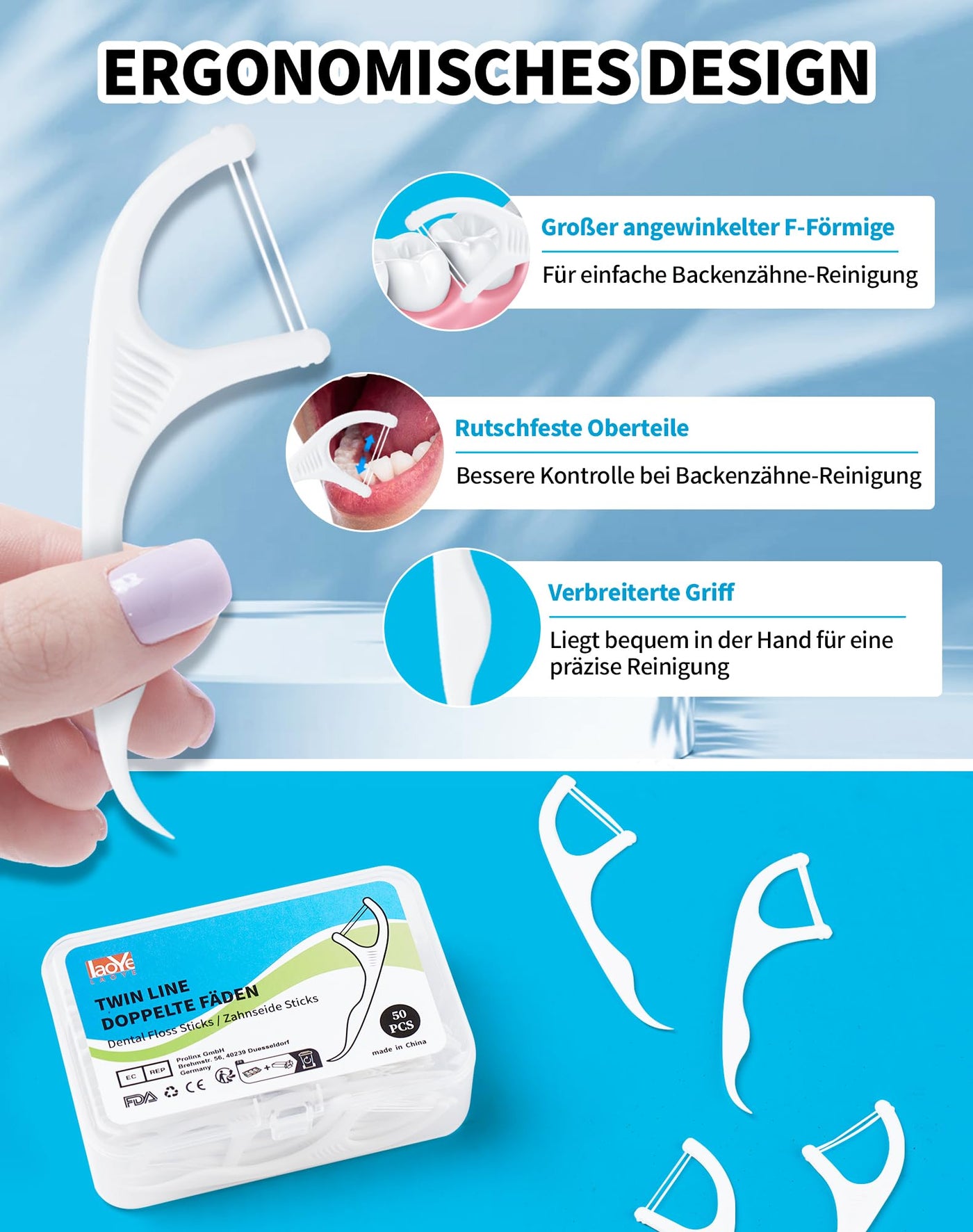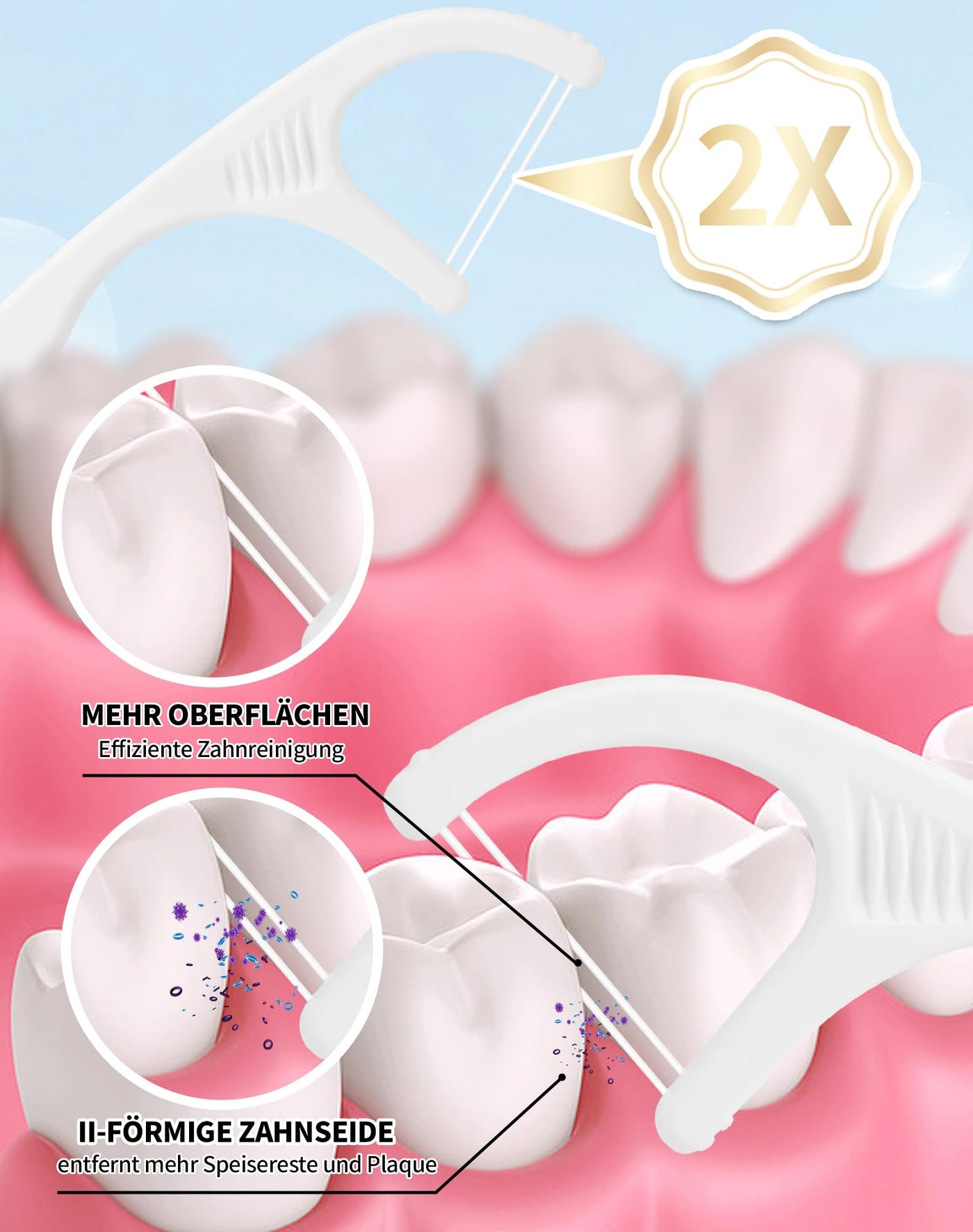 - QUADRUPLE INTERDENTAL CLEANING: Double floss for even more thorough cleaning! The double thread reaches more surfaces and cleans many hard-to-reach interdental spaces (2X) through up and down movements, II-shaped dental floss offers 4X more effective cleaning, allowing you to remove 80-90% more food particles and plaque compared to single thread dental floss stick.