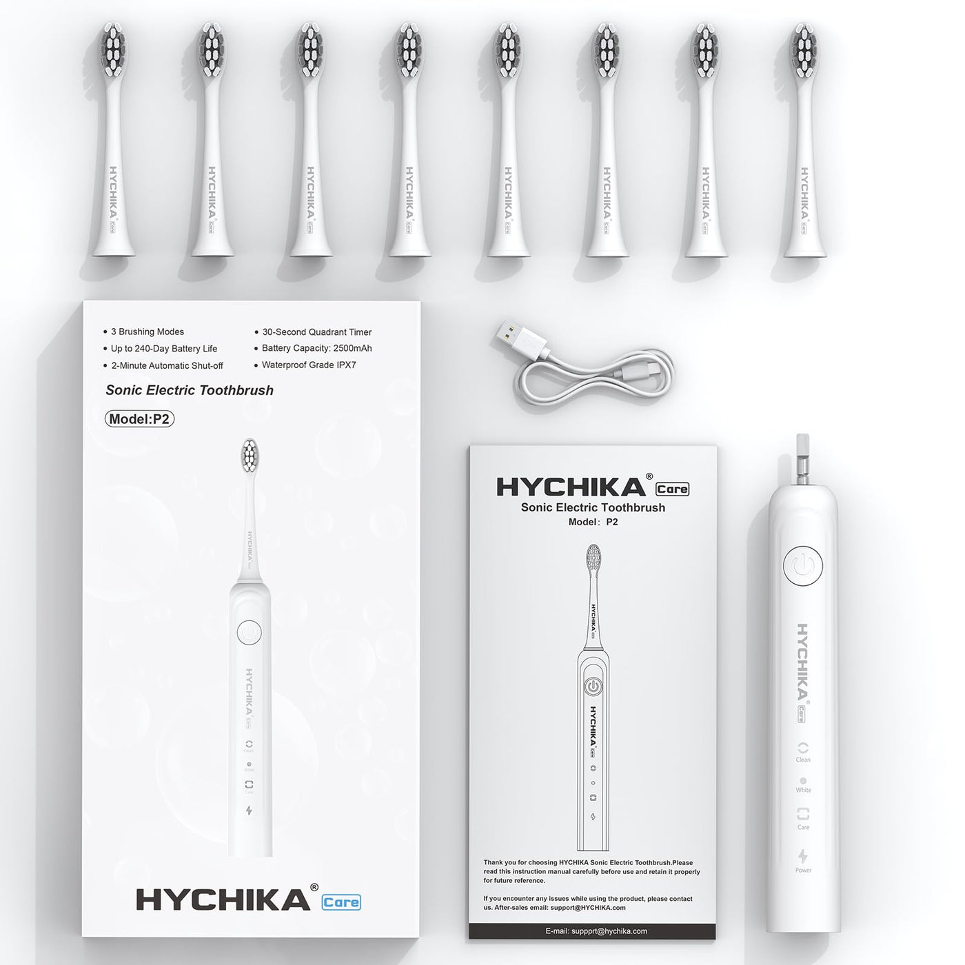 - The package includes: 1 HYCHIKA sonic electric toothbrush; 8 High-end toothbrush heads ; 1 USB-Type C charging cable; 1 Instruction Manual.