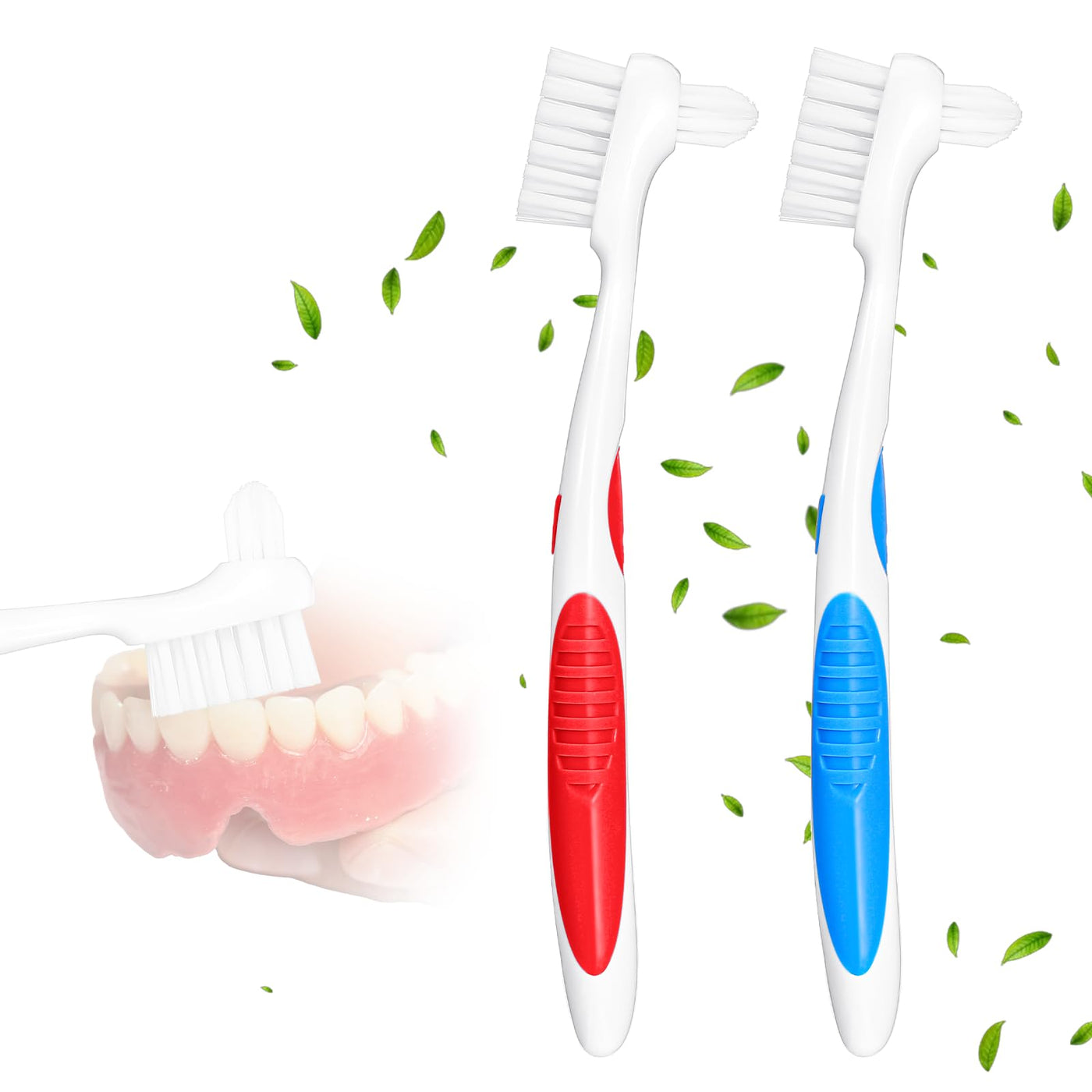 2PCS Denture Brush Set - Dual-Head Denture Cleaning Brush with Ergonomic Rubber Handle Multi-Layered Soft Bristles (Blue & Red)