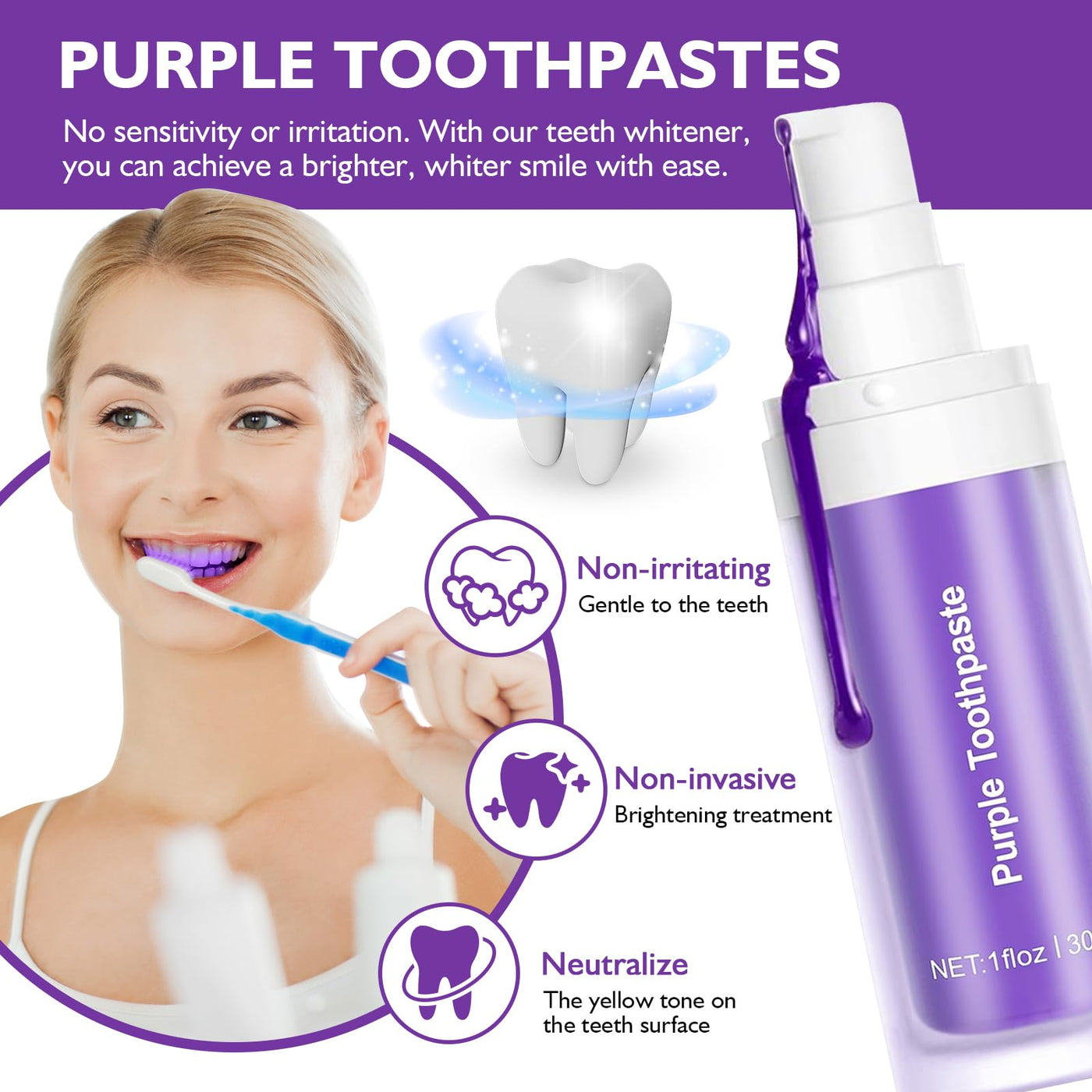 - Gentle Ingredients: No sensitivity or irritation.Jwtolp purple teeth whitening toothpaste perfectly for people with sensitive teeth. It does not erode tooth enamel and is safe