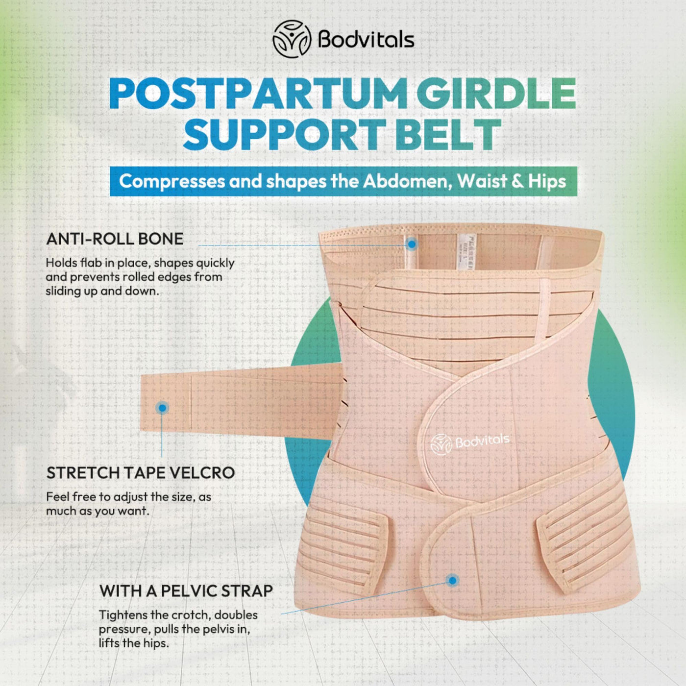 - Compression Benefits of Postpartum Belt: Postpartum belt after delivery helps in reducing postpartum discomfort and swelling. Aids in shrinking the uterus back to its pre-pregnancy size. Postpartum belt supports weakened abdominal muscles for faster recovery. Postpartum girdle belt also makes you look instantly slimmer, adding confidence and helping you feel better post delivery.