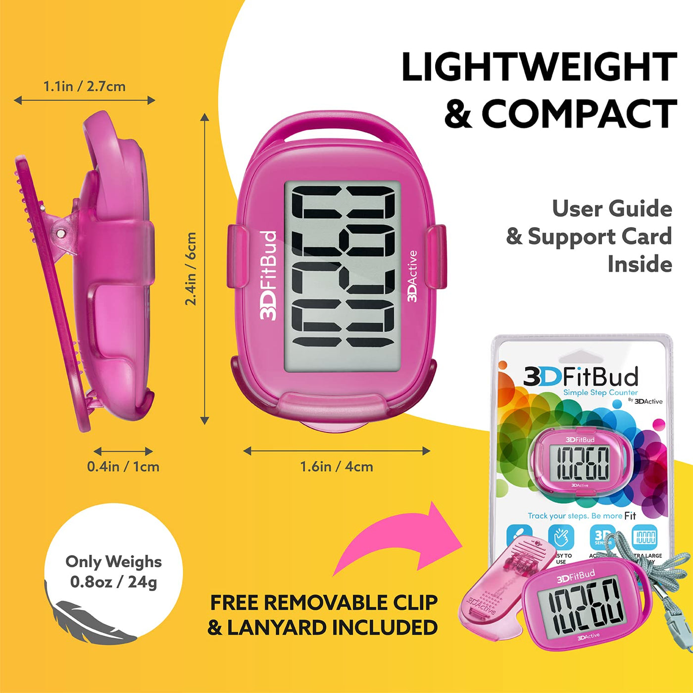 3DFitBud Simple Step Counter Walking 3D Pedometer by 3DActive with Clip, Lanyard Accurate Step Tracker Large Display, Easy to Use for Kids Men Women Adult Seniors Daily Step Tracking - A420S Pink