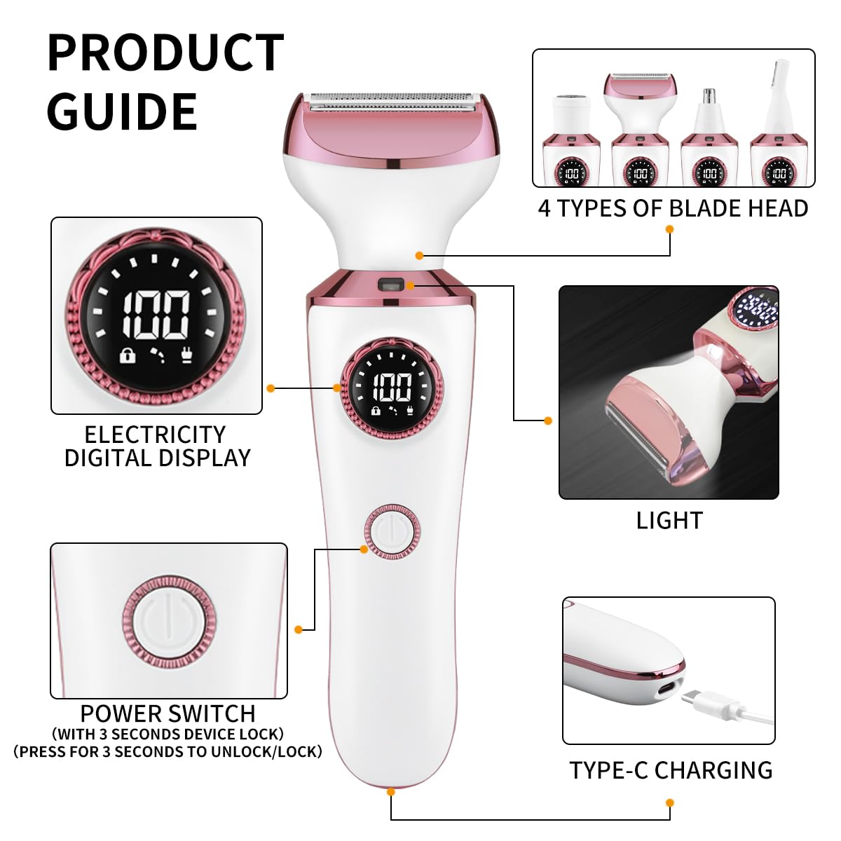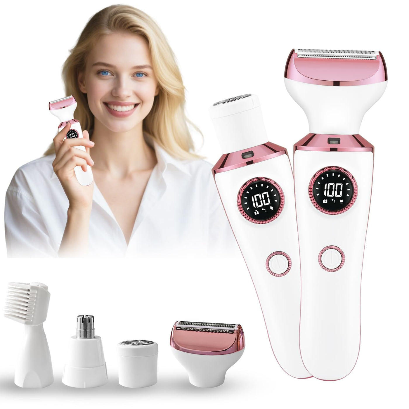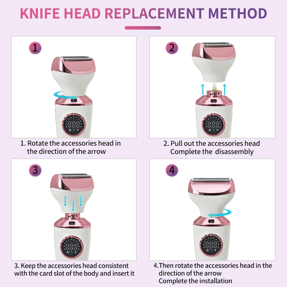 - 4-in-1 Versatile Shaving Heads Equipped with four specialized heads for shaving, eyebrow shaping, nose hair trimming, and hair trimming. Effectively removes unwanted hair from face, arms, legs, body, bikini line, and underarms for confident, beautiful results.