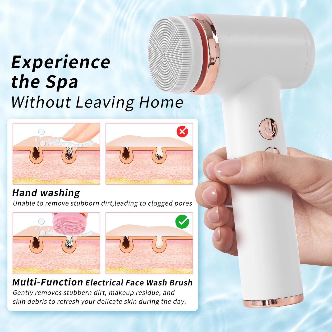 - Experience the Spa Without Leaving HomeWith 4 removable, multi-functional brushes including an exfoliating brush, silicone brush, pore cleansing brush, and steel bead brush, this power cleansing brush allows you to customize your personal cleansing routine at home, gently removing stubborn dirt, makeup residue, and skin debris to leave your delicate skin refreshed and revitalized during the day and refreshed and relaxed at night.