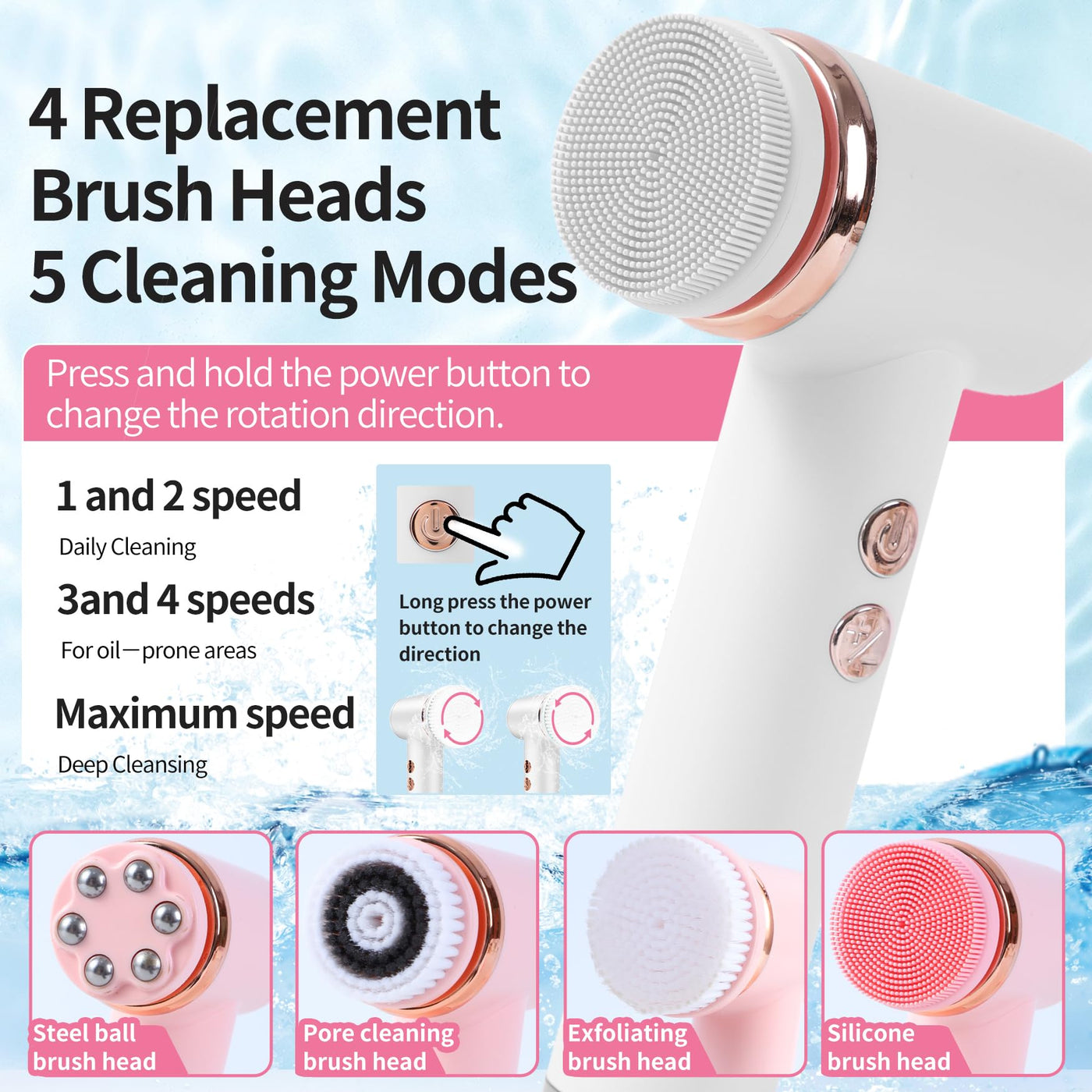 - 5 Levels of Cleansing Intensity to Meet Various Facial Cleansing NeedsThis newly upgraded cleansing brush offers 5 personalized speed modes up to 8800 rpm to ensure that all of your cleansing needs are met. 1 and 2 speeds are for daily cleansing and sensitive skin care, 3 and 4 speeds are used to cleanse oil-prone areas of the skin, and the highest speed is used to remove make-up and for deep cleansing.