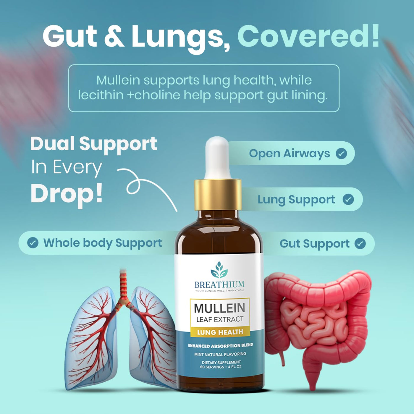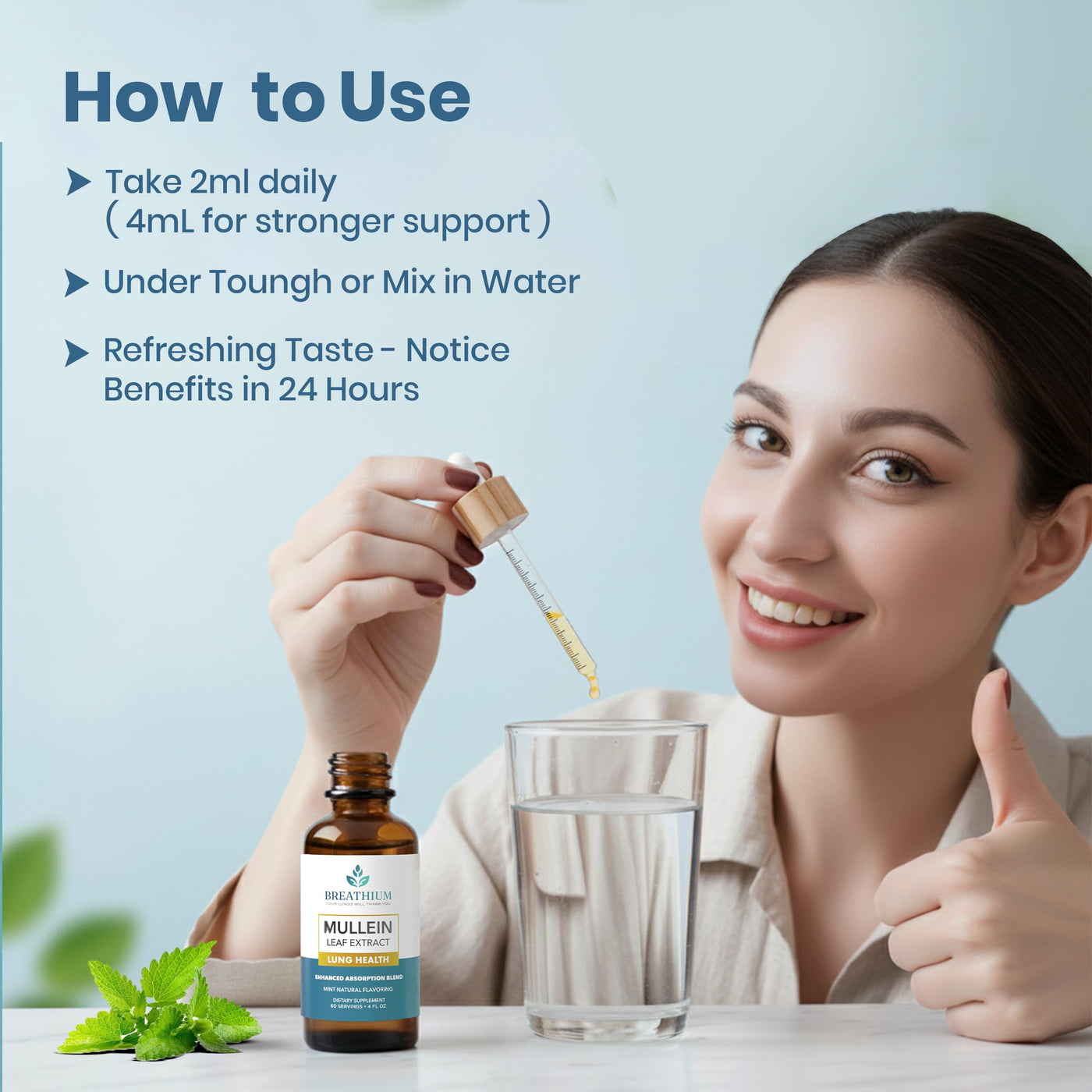 - EASY AND CONVENIENT TO USE- Each bottle provides 30 servings with a precision dropper for quick daily dosing. Take 2 droppers of Breathium's Mullein Extract for lungs under your tongue for maximum absorption, or mix with water or juice. The refreshing peppermint flavor makes it simple to integrate into your wellness routine.
