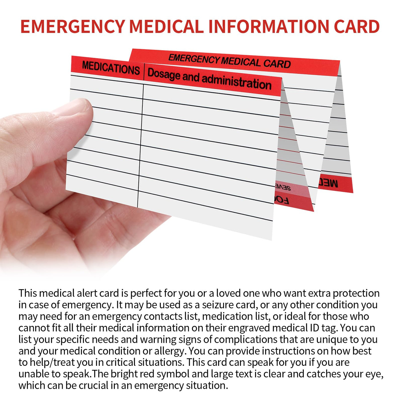 - Bright Red Symbol:This medical alert card is perfect for you or a loved one who want extra protection in case of emergency. It may be used as a ID card, or any other condition you may need for an emergency contacts list, medication list, or ideal for those who cannot fit all their medical information on their engraved medical ID tag. This card can speak for you if you are unable to speak.The bright red symbol and large text is clear and catches your eye, which can be crucial in an emergency situation.