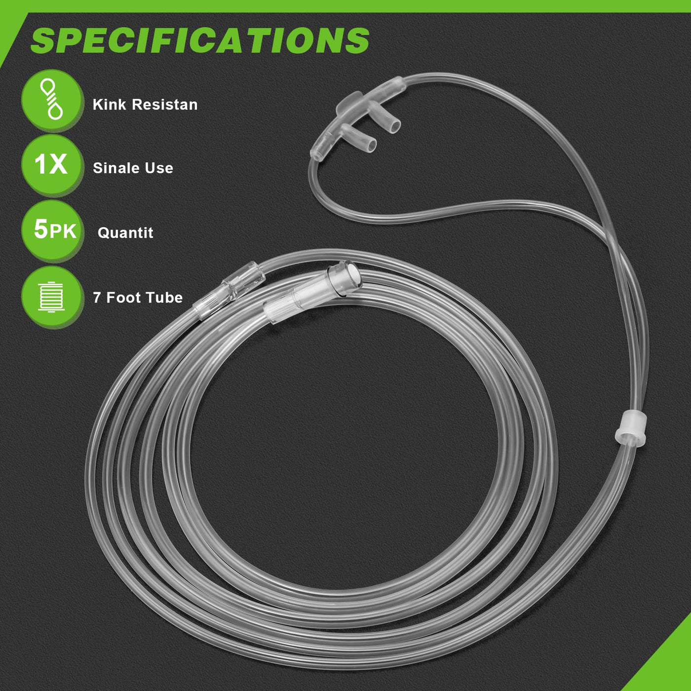 5 Pack Soft Nasal Oxygen Cannula for Adult - 7 Feet, Standard Connector, Kink Resistant, Lightweight Tubing for Comfortable Oxygen Delivery, Green