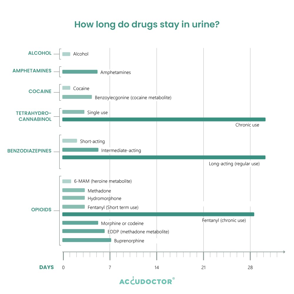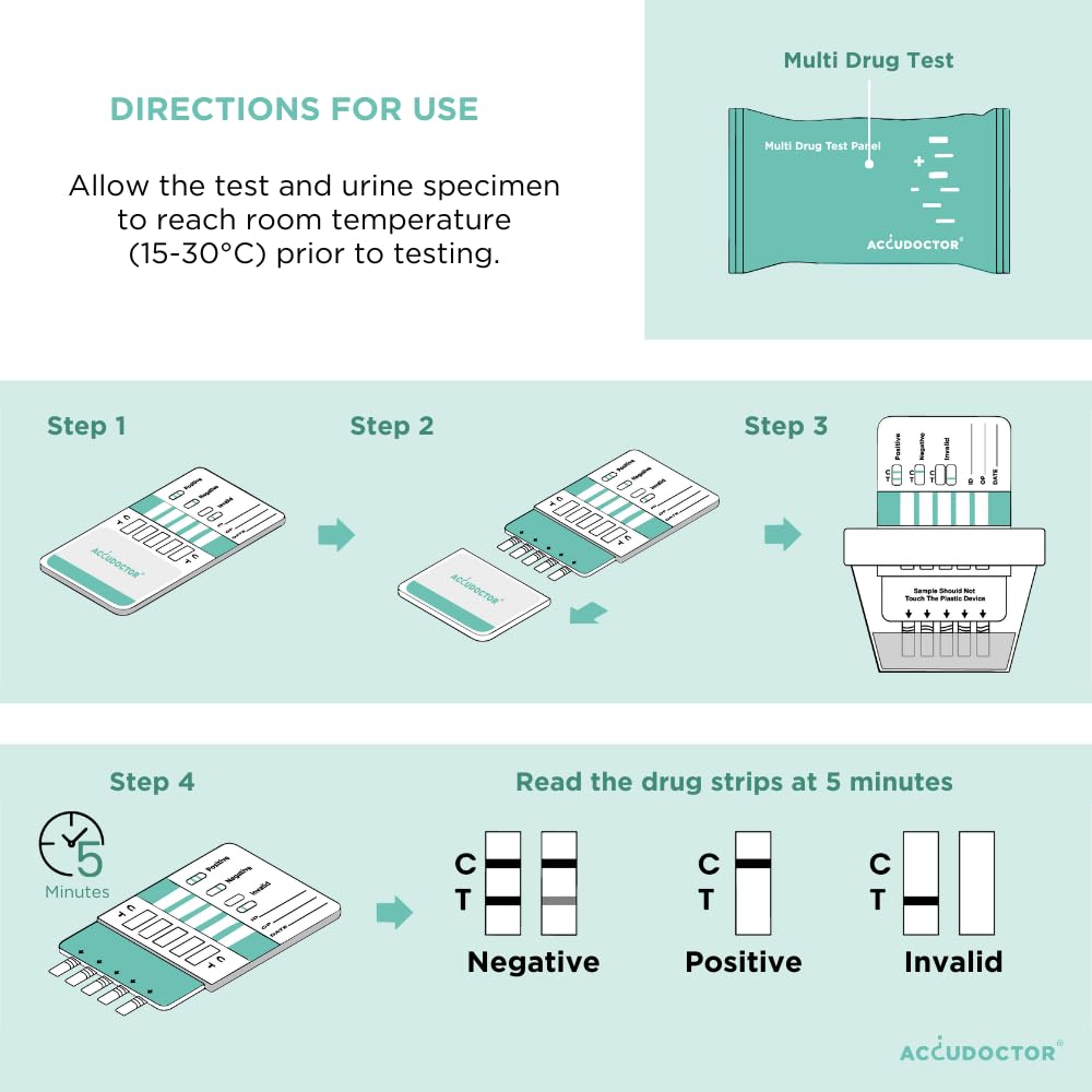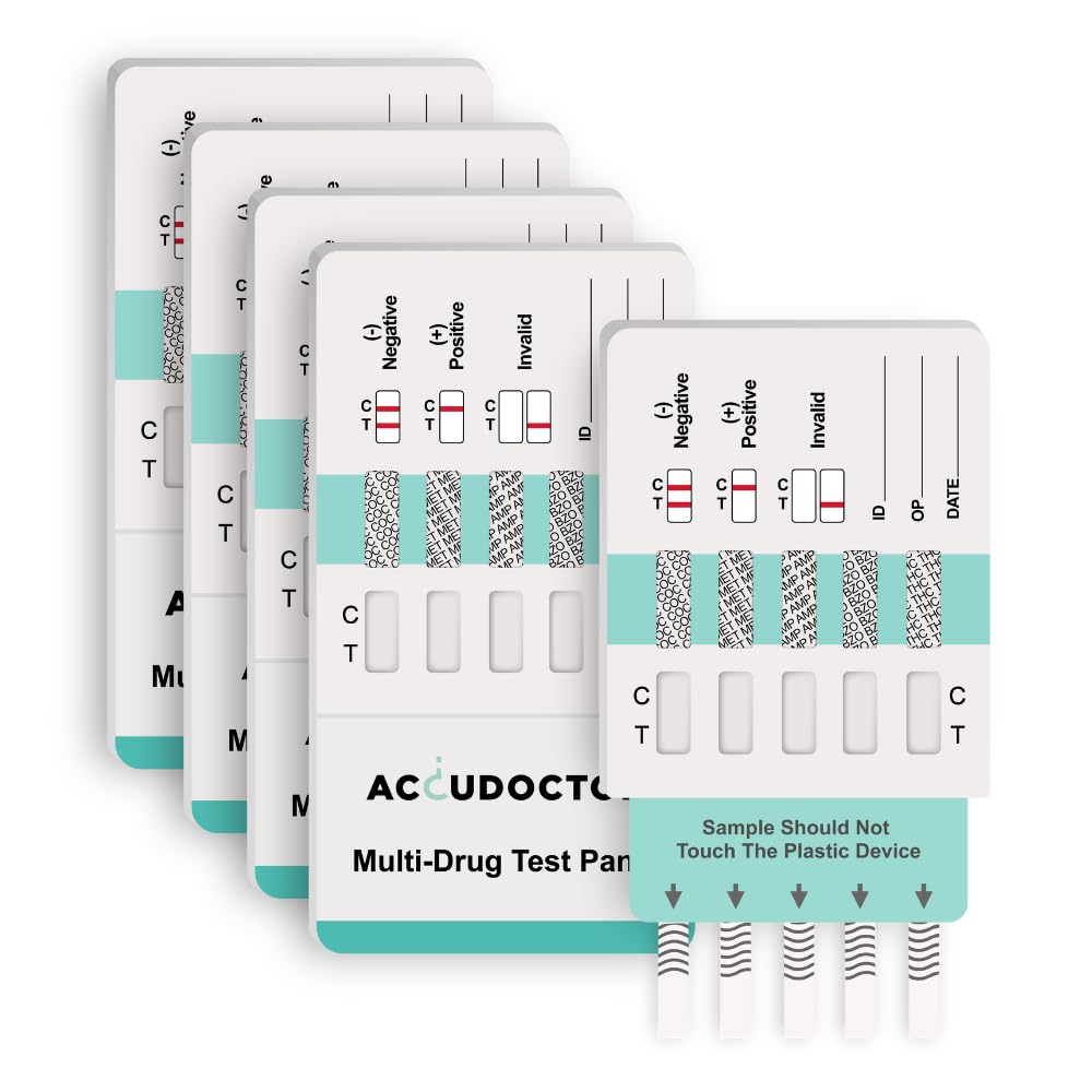 - 5 ACCUDOCTOR MULTI DRUG TEST FOR 5 TYPES OF DRUGS: The Accudoctor multi-drug test test detects the 5 most commonly used drugs today with the following limit values: THC -tetrahydrocannabinol cannabis 25 ng/ml, cocaine 300 ng/ml, benzodiazepines 300 ng/ml, amphetamine 1,000 ng/ml and methamphetamine 1,000 nl/m. Delivery includes 5 individually packaged tests and instructions in 5 languages.