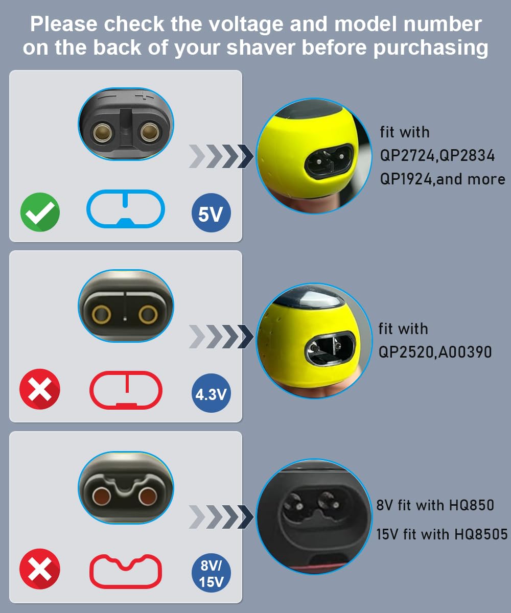 - Attention: The output is 5V, not suitable for 4.3V, 8V and 15V. Not suitable for Philips Oneblade QP2630,QP2620,QP2530,QP2520, QP2510,QP6510, QP6520 ,QP6530,QP6550,QP6505,HQ8505,HQ850, HQ840