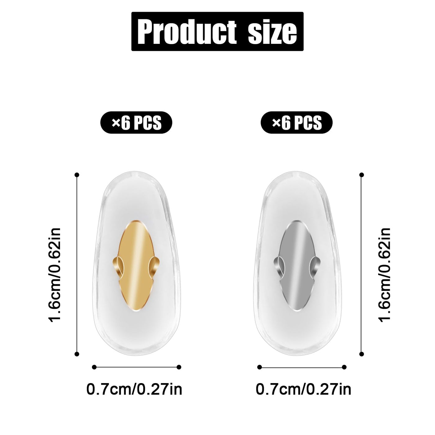 Specification: Color: gold+silver Material: pvc Product Size: as shown in the detail picture Package details: 6 pairs x replacement nose pads for eyeglasses Note: Due to manual measurement, the size and weight may have a certain error. Due to the difference between different monitors, there may be a slight color difference existed.