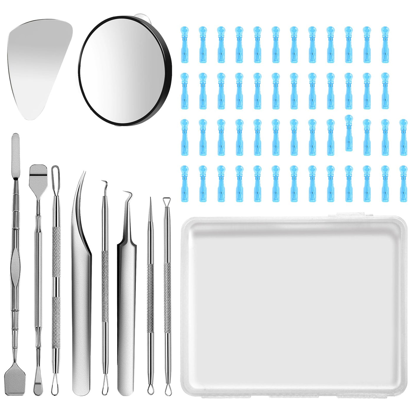 - 100% Healthy Material:420 stainless steel material with polished design, pimple popper can avoids hurt with the right ways. 60 pieces blackhead extractor, including 10 kinds of 420 metal tools with blackhead remover tweezers which are reusable, and another 50 sharp needles which can easily puncture pimples without leaving scars.