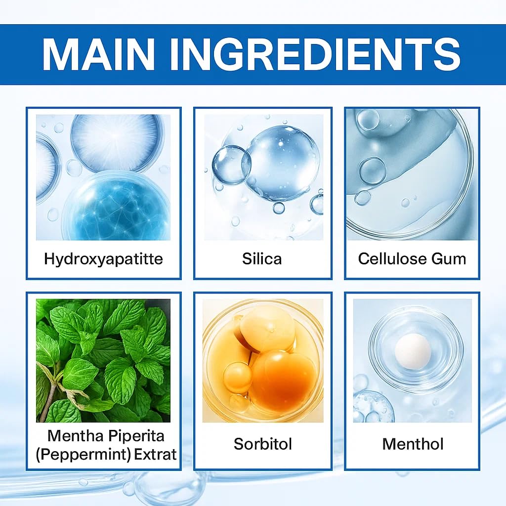 - Formulated with 7.5% Hydroxyapatite Toothpaste for Enamel Support: Formulated with 7.5% hydroxyapatite toothpaste, this advanced oral care solution strengthens enamel and helps reduce sensitivity. Ideal for those seeking a science-backed, clean-label toothpaste with proven hydroxyapatite benefits.