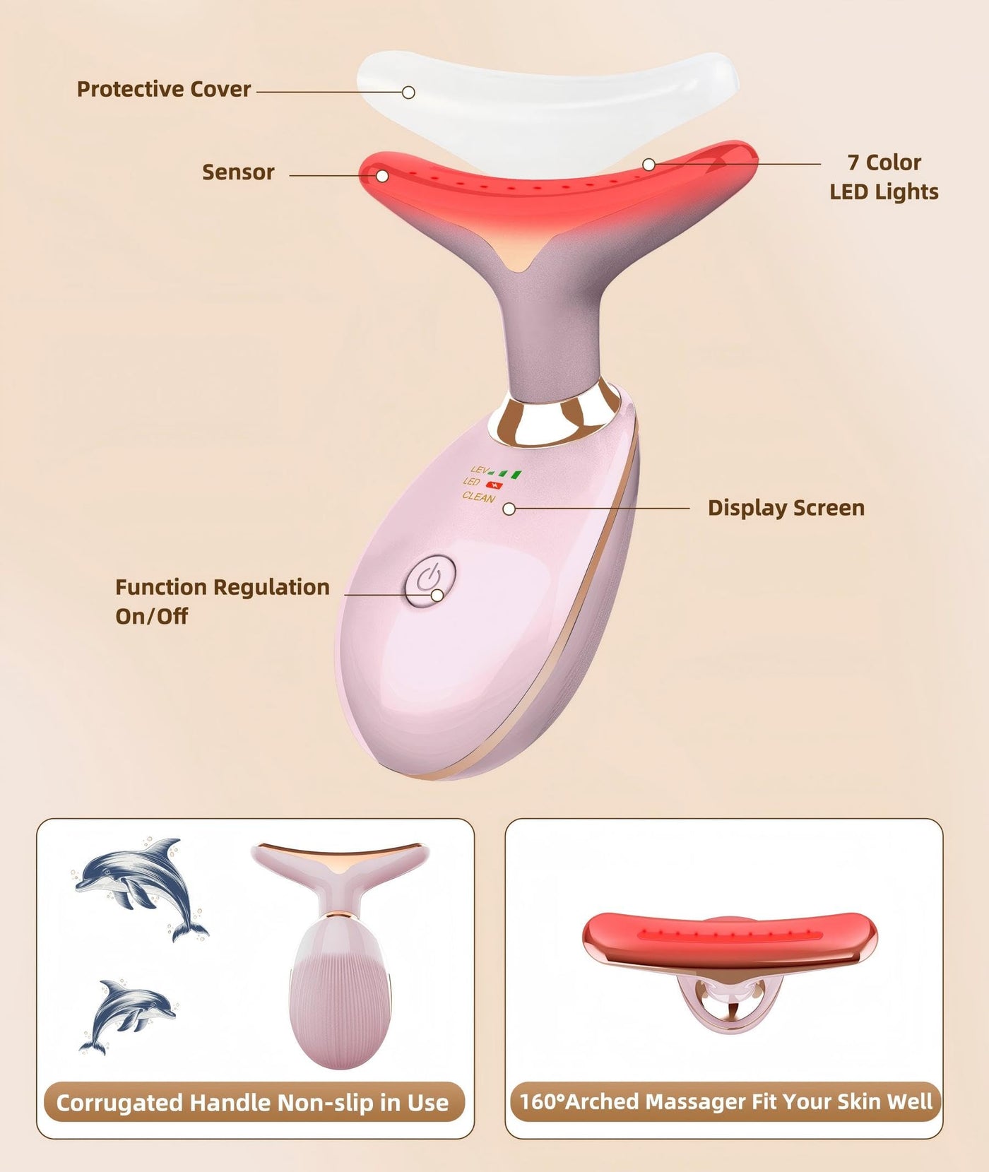 7 Color Face and Neck Massager Light Therapy, Red Light Based Facial Massager for Skin Care, Firming, Smoothing (Pink)