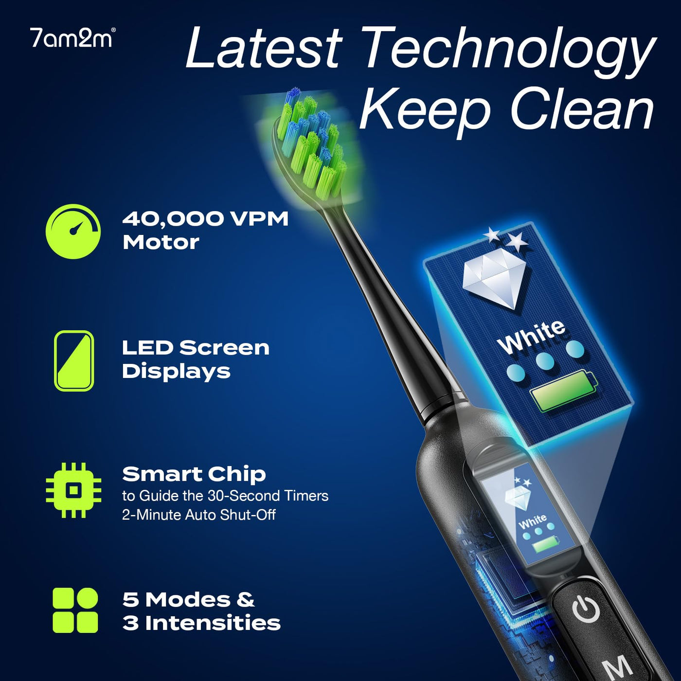 7AM2M Electric Toothbrush for Adults & Teens with LED Screen, 3 Intensity Levels & 5 Modes, One Charge for 90 Days, Fast Charge & Holder, 2 Mins Built in Smart Timer, with 8 Brush Heads (Black)