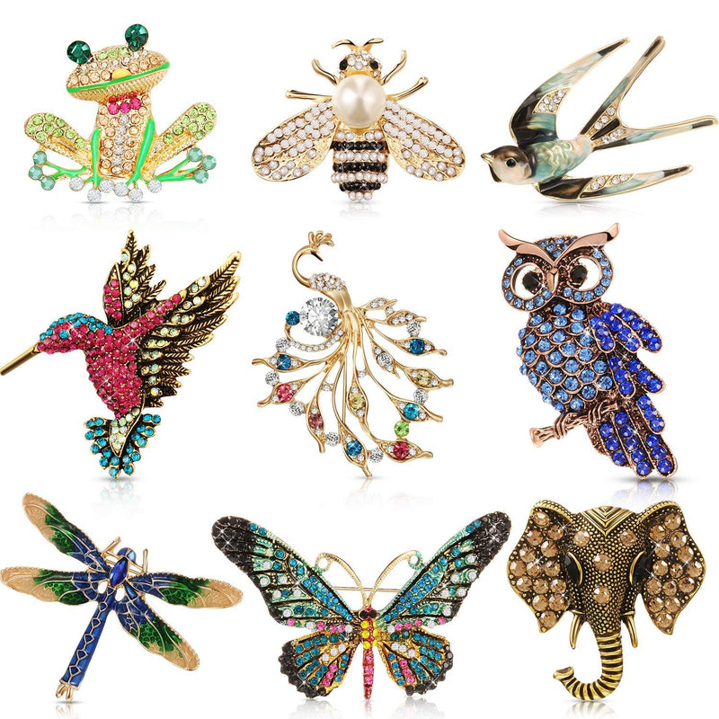 - You will get: 9 pieces multi-colored animal brooch pins include dragonfly, butterfly, hummingbird, owl, elephant, peacock, bee, swallow and frog shapes, different shapes for you to match your outfits