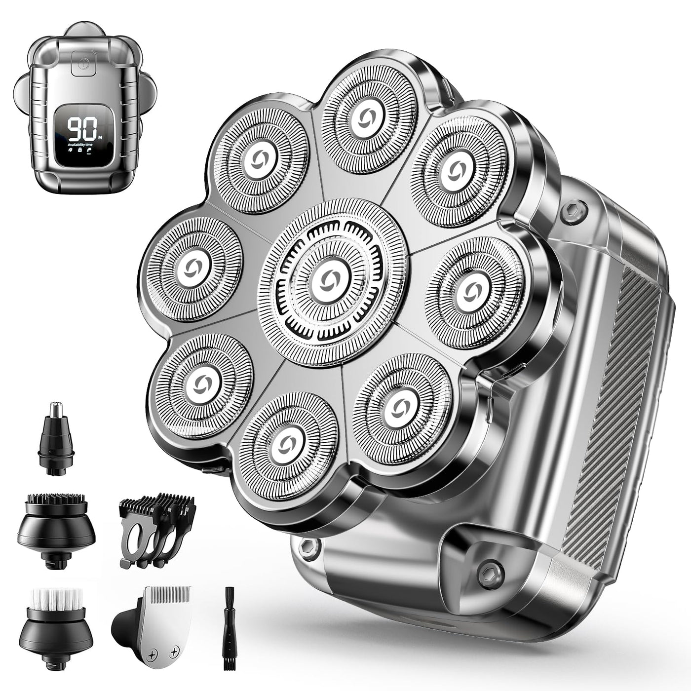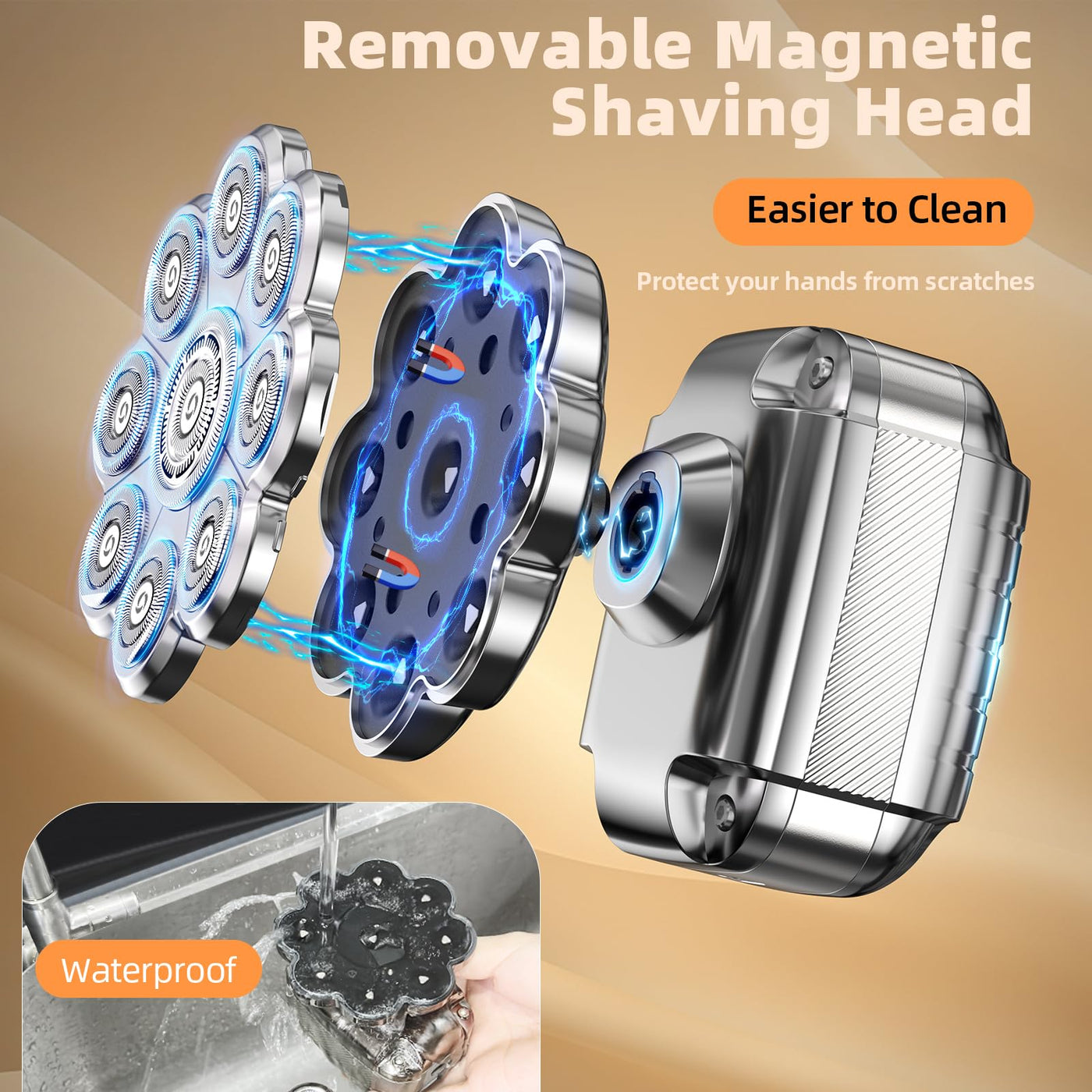 - 9D Smooth Shaving Heads: This head shaver for bald men is equipped with 9 floating heads and has been carefully ergonomically designed to fit the curves of your scalp, neck and face perfectly and gently, giving you a precise and smooth shaving experience. Combined with a powerful high-speed motor, this electric shavers for men can quickly and efficiently remove more hair, significantly reducing shaving time, allowing you to easily cope with daily care in your busy life. [CAUTION]: When removing head, pull straight up. Twisting may break the drive mechanism.