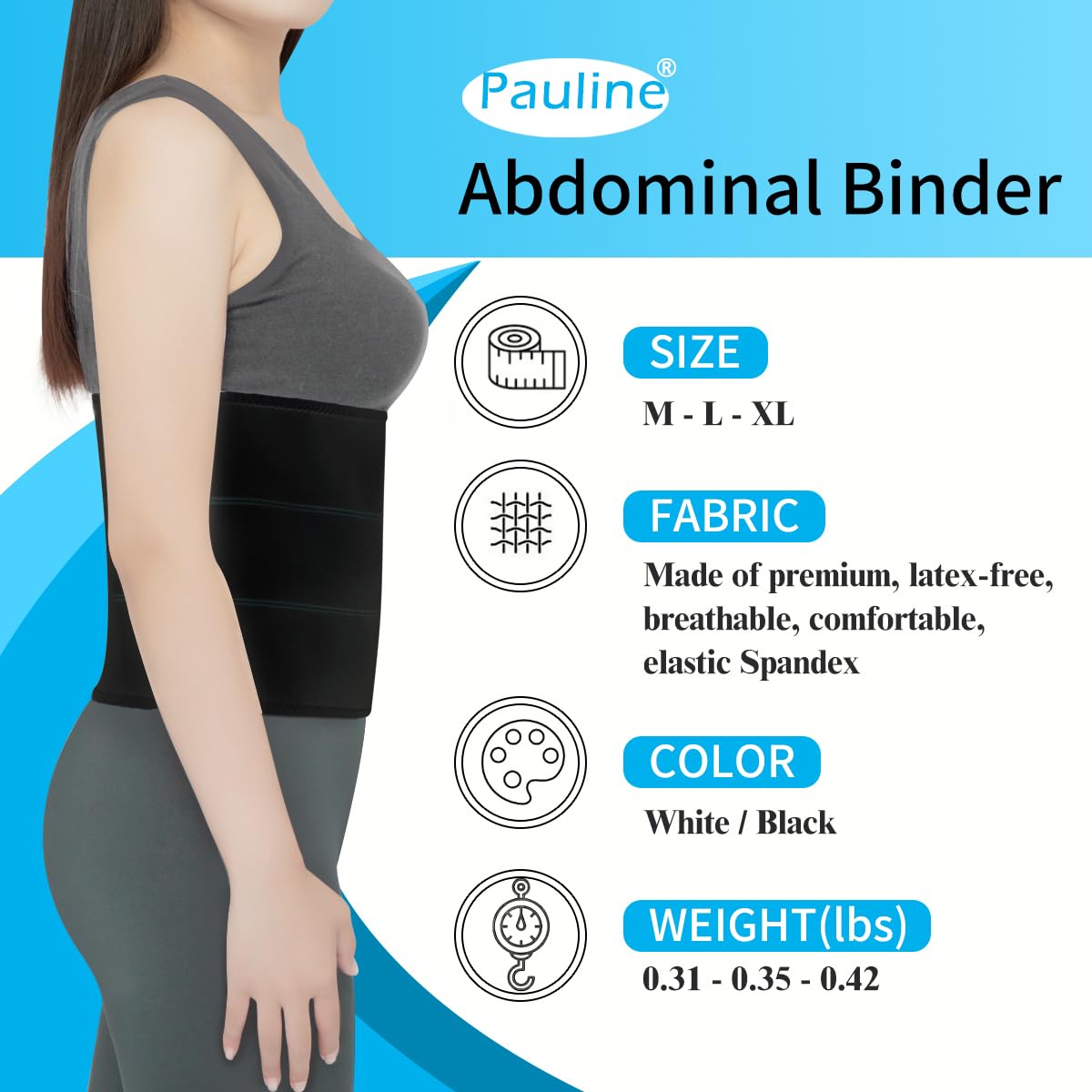 - + SOFT, BREATHABLE FABRIC FOR COMFORT - Pauline abdomen binder is constructed from flexible, breathable, and stretchy Spandex fabric that is gentle on skin. The latex-free material provides comfortable compression without irritation or rashes for all-day wear.