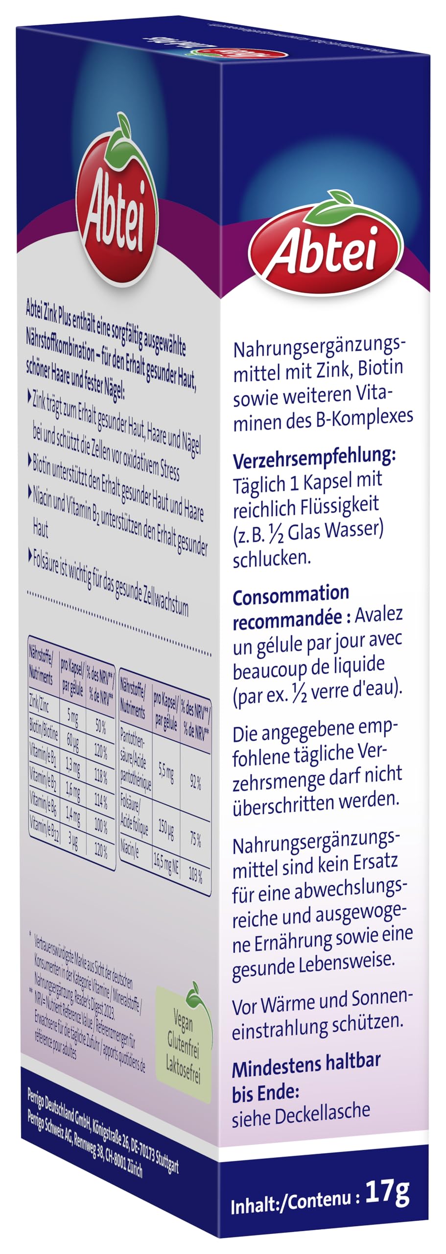 Product description Product description Zinc is a valuable and essential trace elements for humans and is important in many areas biological processes involved. Zinc helps maintain healthy skin, strong hair and stronger nails, which are part of our natural Protective barriers and are permanently exposed to external influences. Zinc also protects cells from oxidative stress. The Dietary supplement Abbey Zinc Plus contains this vital ingredient Mineral, combined with biotin, folic acid and other B vitamins. Biotin Supports, among other things, the maintenance of healthy skin and hair - folic acid is important for healthy cell growth. Abbey. Time for health. Abbey has has been committed to supporting health for 125 years. With our wide range of products, we offer you the opportunity to optimize a health-conscious lifestyle. Whether vitamins, minerals or other nutrients, dietary supplements or cold remedies - With our products everyone can promote their well-being. Ingredients / Ingredients Ingredients: Rice flour, hydroxypropyl methylcellulose (capsule shell), starch, Nicotinamide, zinc citrate, anti-caking agent: magnesium salts of fatty acids; Calcium D-pantothenate, vitamin B6, vitamin B2, vitamin B1, folic acid, biotin, Vitamin B12 instructions for use: 1 capsule daily with plenty of liquid (e.g. ½ glass of water) swallow Legal information dietary supplements are not a substitute for a varied and balanced diet a healthy lifestyle. The stated recommended daily consumption amount must not be exceeded Gluten-free, lactose-free, vegan Outside the Keep out of reach of small children. From heat and sunlight protect. Contents: 32 capsules = 17 g Notes after Food Information Ordinance (LMIV) If you need information about Ingredients and ingredients according to the Food Information Regulation (EG/1169/2011), please contact us using the Amazon Contact function 'Do you have a question for the dealer? - Ask questions', the opens when you click on the colored dealer name. The information The dealer name is to the right of or below the price article. Ingredients/Ingredients Ingredients: Rice flour, Hydroxypropylmethylcellulose (capsule shell), starch, nicotinamide, zinc citrate, Anti-caking agents: magnesium salts of fatty acids; calcium D-pantothenate, Vitamin B6, Vitamin B2, Vitamin B1, Folic Acid, Biotin, Vitamin B12. P.when('A').execute(function(A) { A.on('a:expander:toggle_description:toggle:collapse', function(data) { window.scroll(0, data.expander.$expander[0].offsetTop-100); }); }); Address Manufacturer/Importer Perrigo Deutschland GmbH, Königstrasse 26, 70173 Stuttgart, Germany More