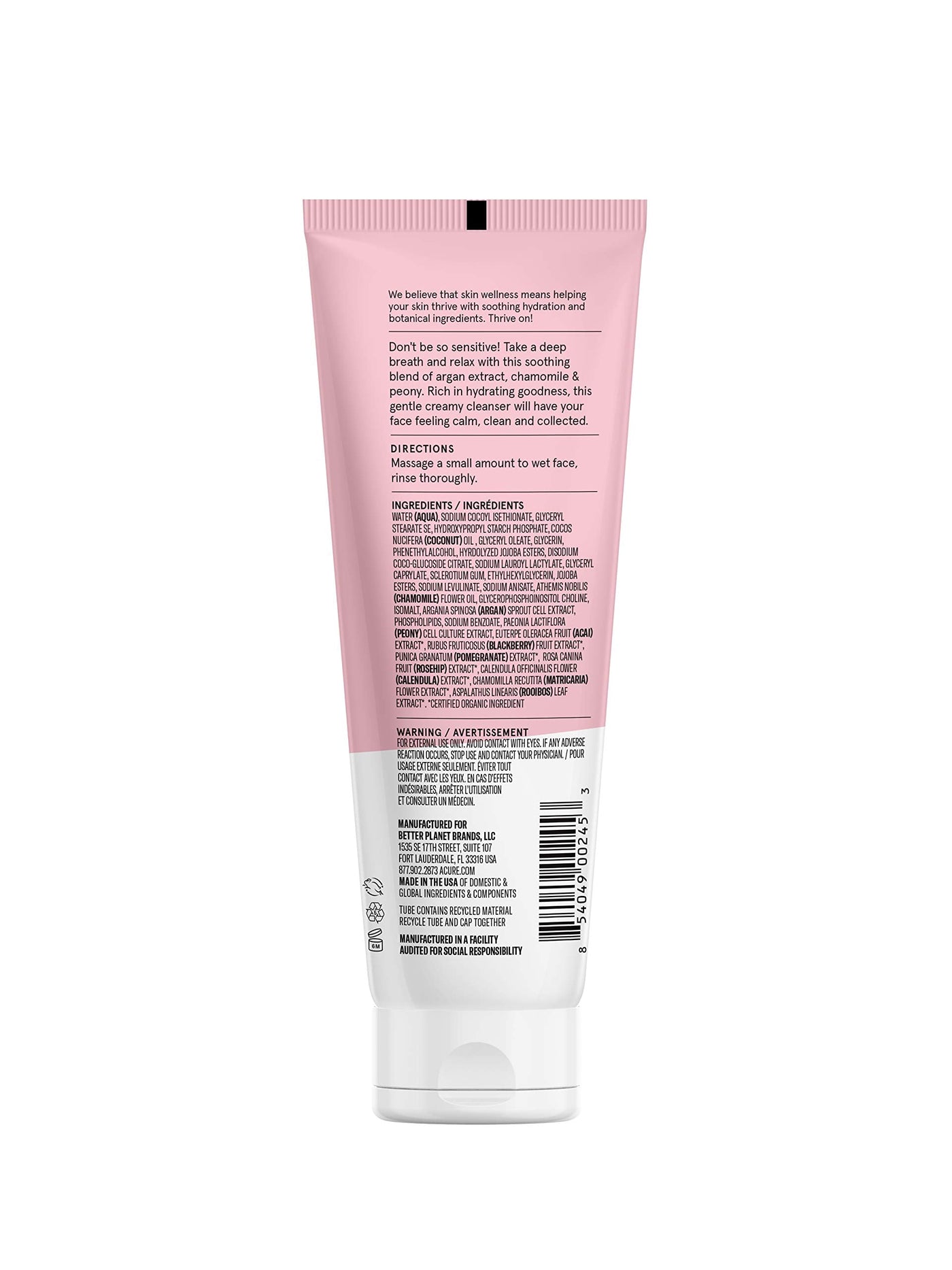 - OUR SOLUTION: Take a deep breath and relax with this soothing blend of organic argan oil, peony extract & sunflower amino acids. Rich in hydrating goodness, this gentle creamy cleanser will have your face feeling calm, clean and collected.