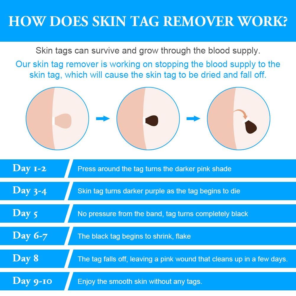 - Safe and Painless Skin Tag Removal is designed for the comfort of your home. When removing skin tags, use the small rubber band method to reduce the blood supply to the skin tags, which causes the skin to dry out and discolor naturally. It comes off in just 314 days, is painless and works like magic!
