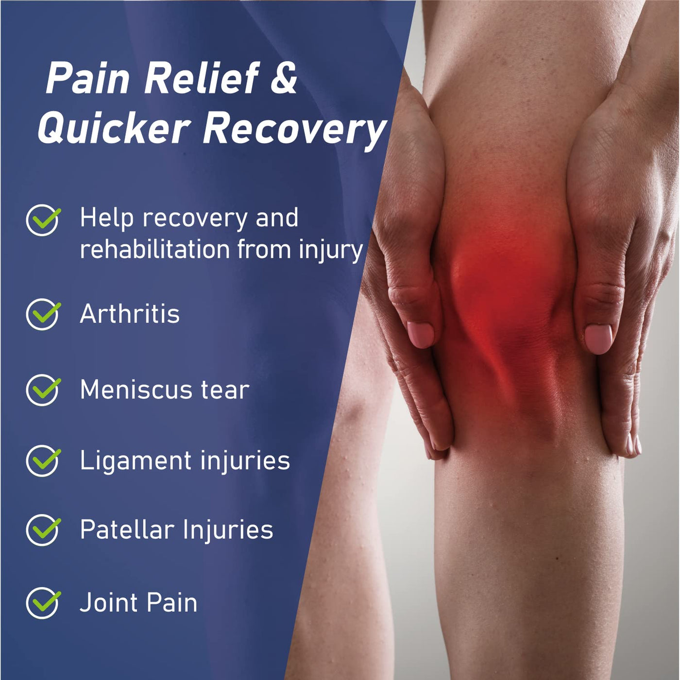 - INSTANT PAIN RELIEF & FAST RECOVERYGet through your day without pain and discomfort! Comforband adjustable knee stabilizer is medically engineered to provide ideal stabilization, pain relief and aid recovery from Knee Arthritis, Meniscus Tear, Patellar tendonitis, ACL PCL MCL ligament injuries, etc. by providing optimal medial/lateral stabilization to weak or injured knee joint. All to help you recover faster and support your joints while being active.