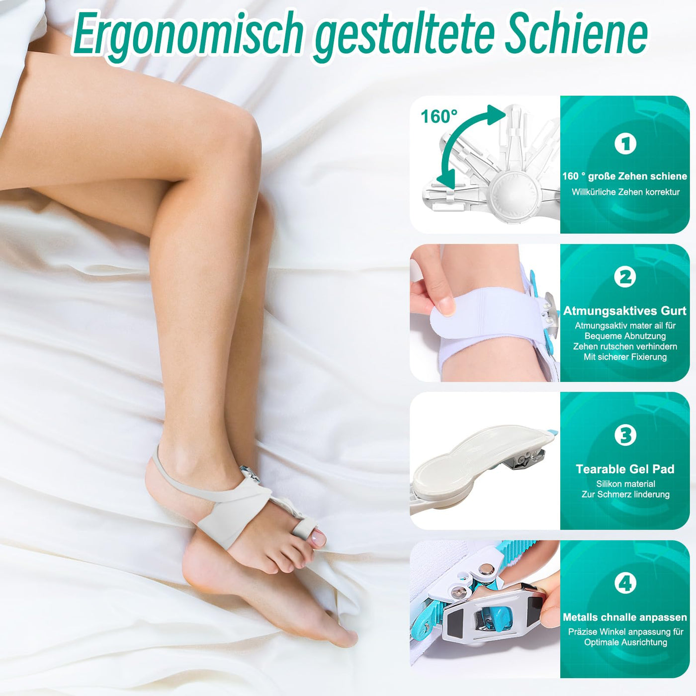 - The hallux valgus bandage developed for us has a pronounced pulling mechanism. This design effectively corrects bunions, overlapping toes, hammertoes, crooked toes and other foot deformities by keeping the big toe in a straight position. Equipped with an adjustable pull knob, you can precisely adjust the angle depending on the severity of your bunion. With an impressive, flexible 160 degree rotation, it gently returns the big toes to their natural alignment. Comfortable and safe, wearable all day