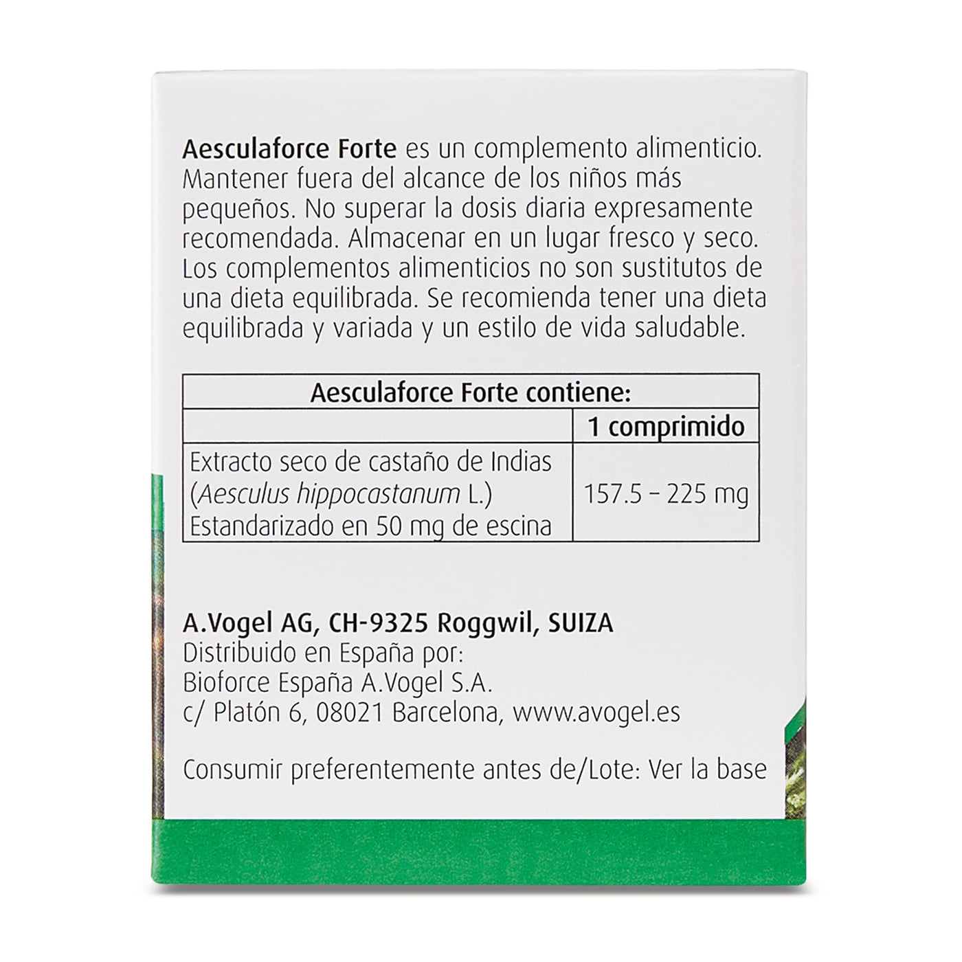 A.Vogel Aesculaforce Forte only uses fresh ingredients to produce it Wild-harvested horse chestnut seeds. The most important active ingredient in the seeds is aescin. These and other substances lead to an improvement Symptoms and stabilize the condition of the venous diseases by in various proven measures supported by clinical studies intervention. Protects the veins and strengthens the capillaries. Aesculaforce Forte is suitable for: circulatory stagnation. Varicose veins edema (swollen legs). Leg cramps, pain and heaviness in the legs. Hemorrhoids Composition: 1 tablet contains: dry extract of seed tincture of Aesculus Hippocastanum (Horse Cathana) 158-225 mg. Application: Take Take 1 tablet daily with a little water during a meal. lactose and gluten free.
