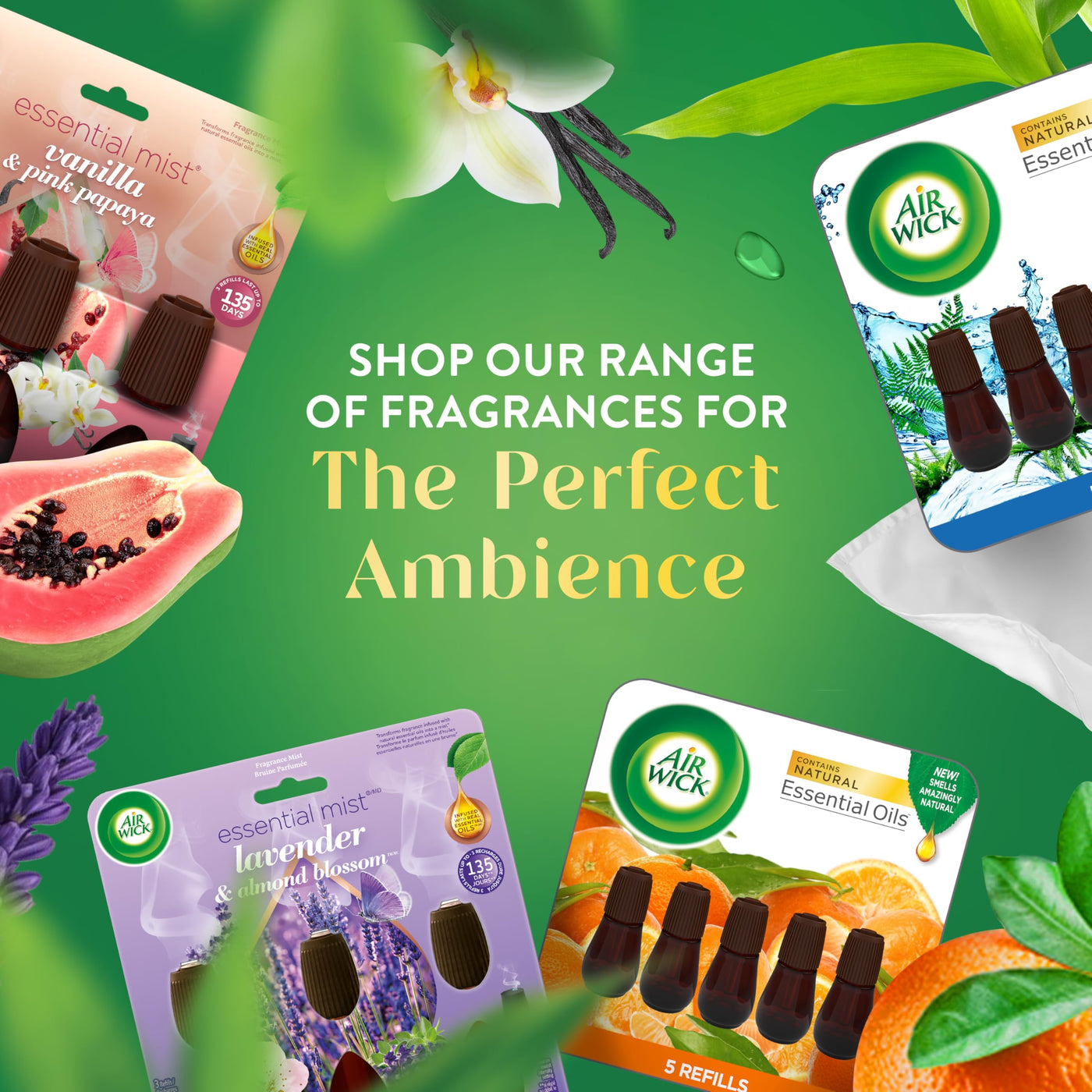 Discover the more natural and premium fragrance infused with natural essential oils diffused by mist with Air Wick Essential Mist diffuser. It transforms fragrance infused with natural essential oils into a gentle mist that surrounds your home. Several premium fragrances available in refills : Lavender and Almond Blossom, Mandarin and Sweet Tangerine, Coconut and Pineapple, Peony and Jasmine, Sandalwood, Sweet Melon and Vanilla; seasonal scents like Apple Cinnamon Medley, Pumpkin Spice, Sweet Fruit and Nutmeg, Brown Sugar and Vanilla, Fresh Pine and Juniper and, our Aroma range with Happiness, Sleep, Unwind and Rejuvenate.