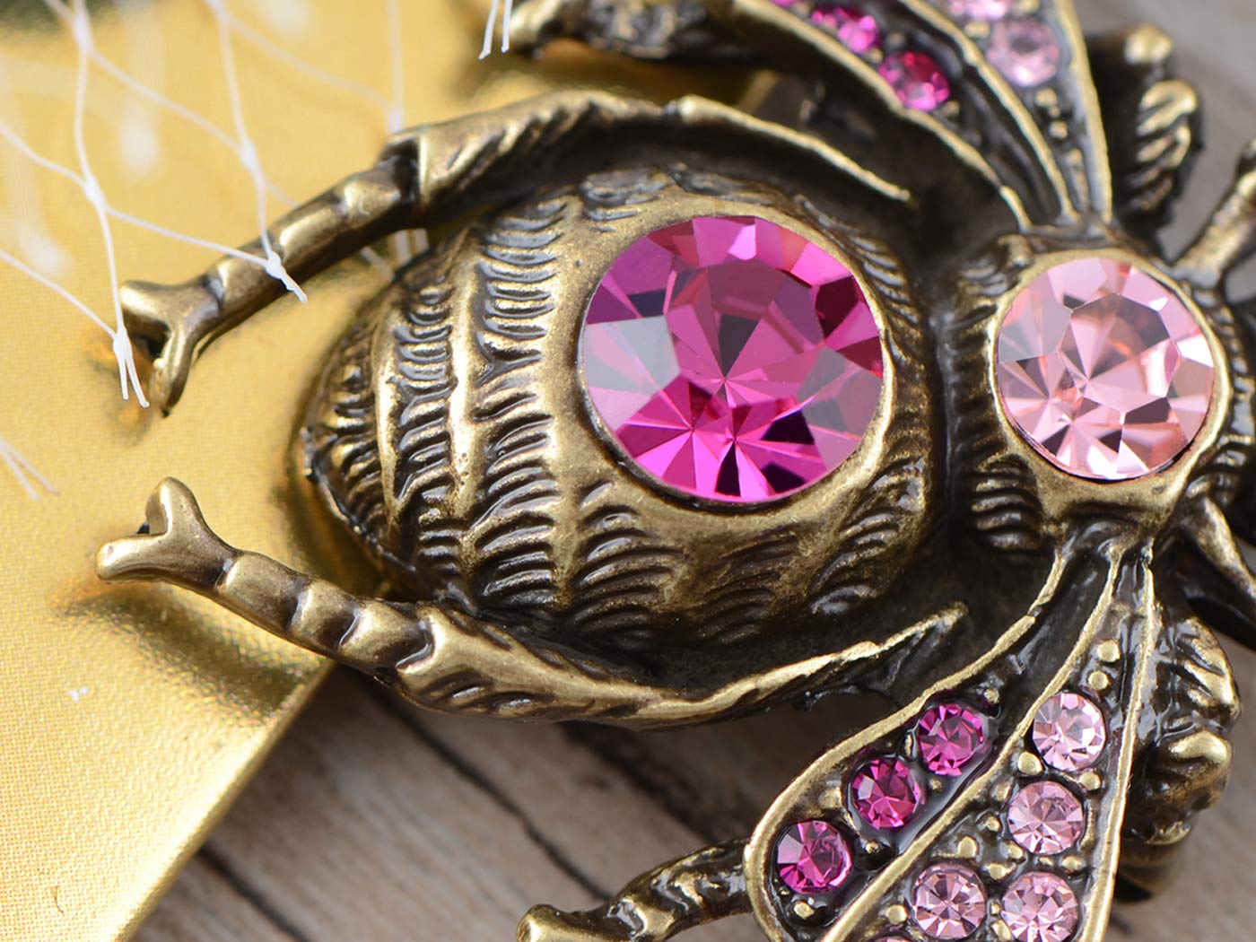 - BRILLIANT ACCESSORY - Adorable vintage inspired bee made from burnished brass toned metal and ornate with sprinkles of pink & purple rhinestones on the wings. This bejeweled bee also has a large pink and amethyst crystal on it's body and tiny aurora borealis stones for eyes.