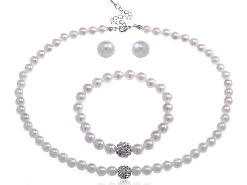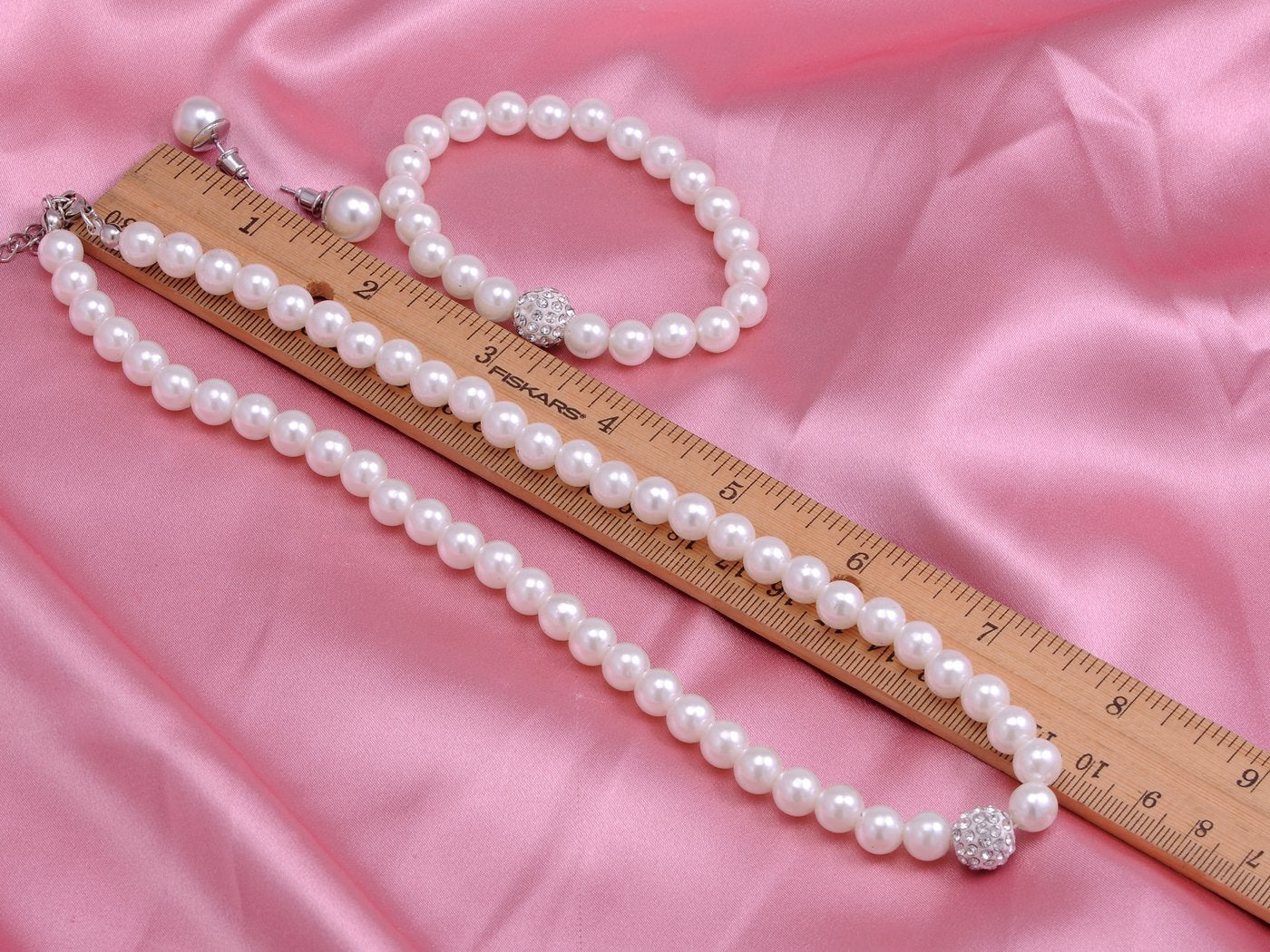 - UNIQUE DESIGN - These stunning silvery tone 3 piece jewelry set made of faux pearls. a 7mm-8mm faux pearl necklace & bracelet with a round cluster clear crystal rhinestones ball, a pair of 10mm pearls stud earrings. This necklace has a adjustable chain to fit your size.