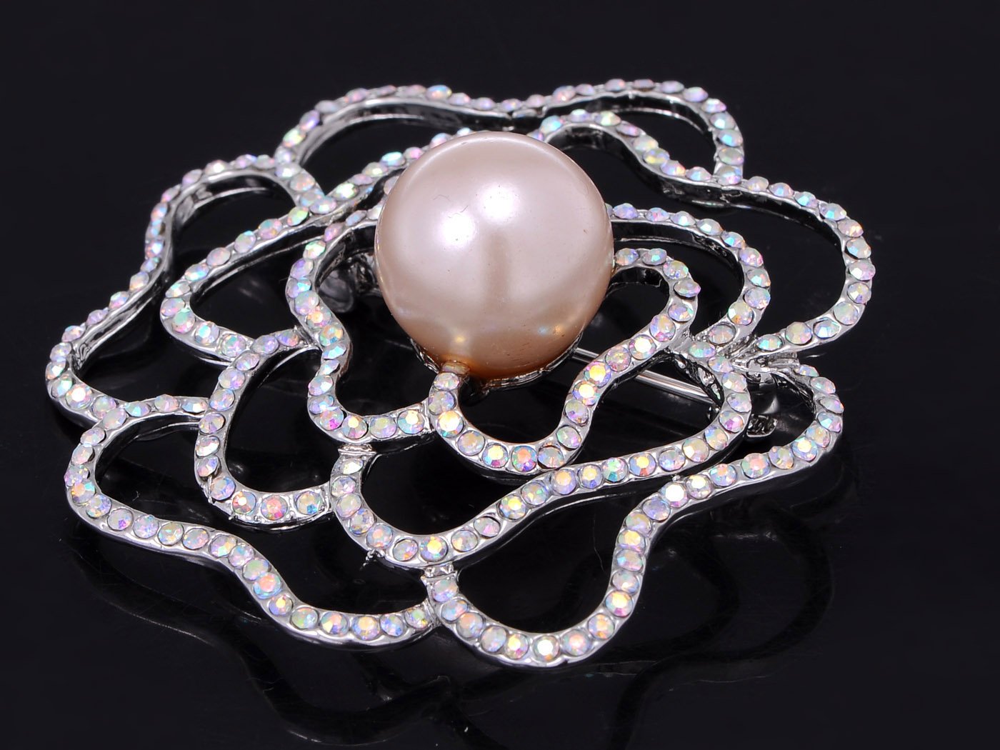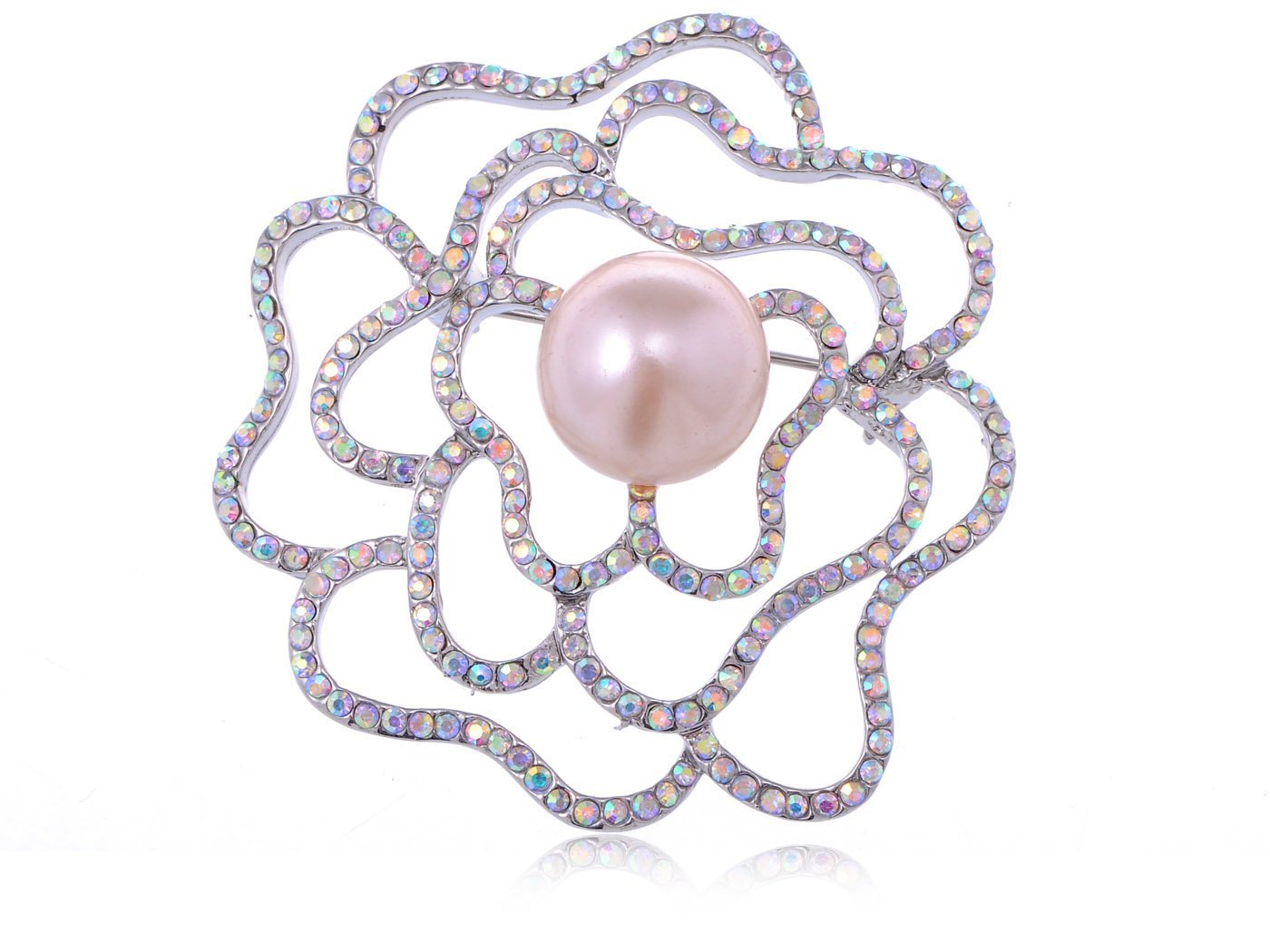 Alilang Silvery Tone Aurora Borealis Rhinestone Flower Rose Stencil Faux Pearl Pin Brooch
