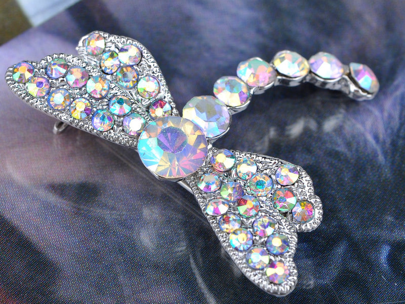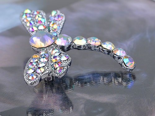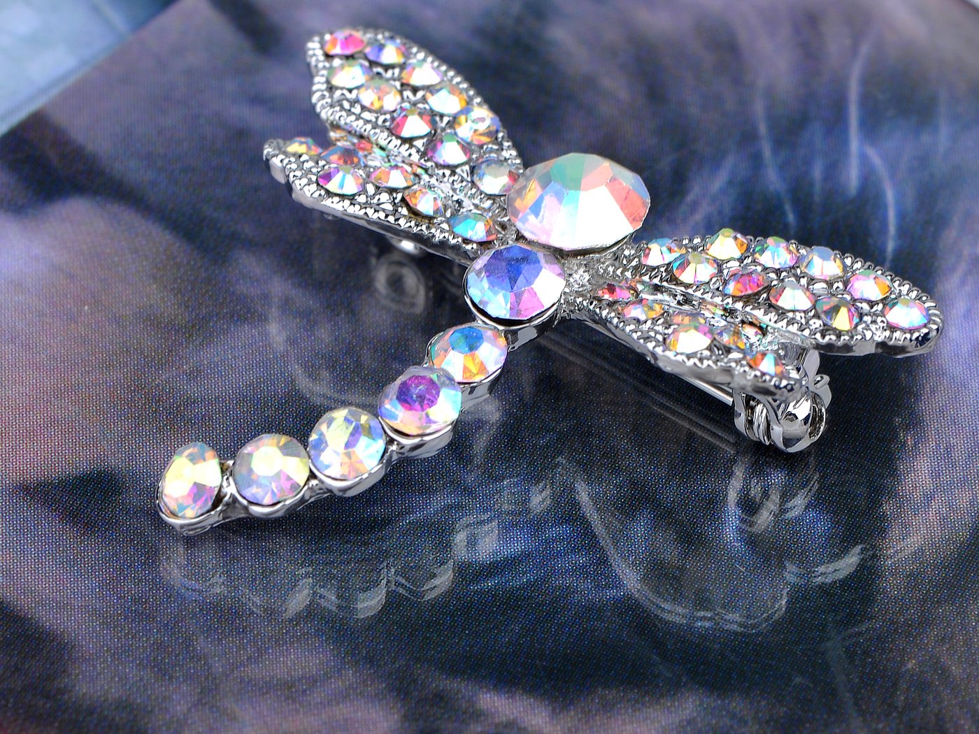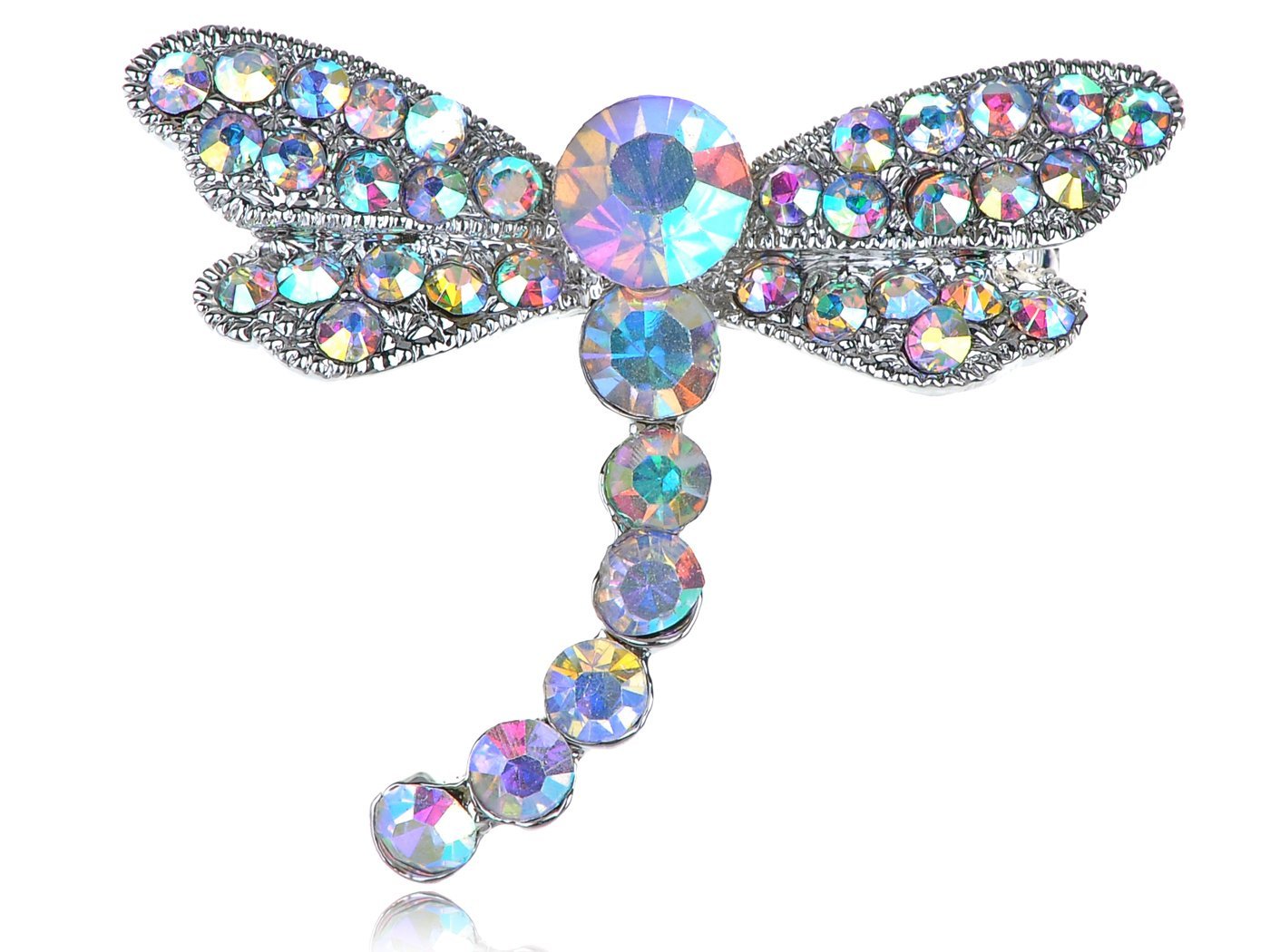 - UNIQUE DESIGN - Brooch featuring dragonfly design with aurora borealis colored rhinestones.